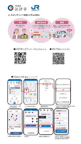 島 根 県 江 津 市 西日本旅客鉄道株式会社 島根県江津市における持続可能な地域社会の構築に向けた オンデマンド交通・ MaaS事業の実施について 西日本旅客鉄道株式会社(本社:大阪府大阪市、社長:倉坂 昇治、以下「JR西日本」)と島根県江津市(市長:中村 中、以下「江津市」)は、2025年10月より「オンデマンド交通・ MaaS事業」(以下、本事業)を開始します。 江津市では、公共交通の縮小、移動手段の不足や人口減少に伴い、住民の生活利便性の低下や観光客の移動制限、地域経済の縮小という課題が発生しており、「移動手段の確保」と「地域の活性化」を同時に達成する新たな取り組みが求められています。そこで、これらの目的を達成するための解決策として、本事業に同市と連携して取り組みます。 昨年度、江津市とJR西日本において実証実験を実施しており、今回JR西日本においては山陰地区のデマンド交通として初めて事業開始いたします。実証実験におけるAIオンデマンド交通利用者アンケートでの満足度は86.4%と、住民の皆様の移動手段としてご好評いただきました。 今後もJR西日本は「持続可能な地域社会の構築に貢献する」ために、地域課題に向き合いながら、地域経済に循環が生まれ成長につながり、将来世代の豊かな暮らしの実現につながる「公共交通に留まらない多様なソリューション」を提案し続け、地域のみなさまとともに取り組んでまいります。 【本事業の内容】 @ AIオンデマンド交通システムの導入 ・地元交通事業者による日中のオンデマンド交通(株式会社REAシステム)の提供 運行名称 :のるイコごうつ(江津市AIオンデマンド交通) 運行エリア:江津市交通空白地 黒松、波積、都治、浅利、松平(川平町を除く) 運行期間 :2025年10月1日〜2028年3月31日 運 行 日:月曜日〜土曜日運行 (国民の祝日(振り替え休日)及び年末年始等 を除く。) 運行時間 :8時00分〜17時00分 運 賃:片道 普通料金 一人400円 特定料金 一人200円(※1) デジタル定期券料金 一人2,000円(※2) (※1)特定料金は乗降場所に「JR駅」または「石見交通バス停」が含まれる場合に限る (※2)30日間の料金 デジタルチケット販売プラットフォーム「まちのヲトモパスポート」において定期券販売を実施します 【予約方法】 ・WEB予約 (JR西日本の公式アプリ「WESTER」からもWEB予約サイトにアクセス可能) ・電話予約(06-7638-1699 電話受付時間 平日9:00〜17:00祝日除く) いずれも2025年10月1日 9:00 から予約受付を開始します。 【注意事項】 ・悪天候、やむを得ない事情等により運行を中止する場合があります。 ・乗車時刻に乗車場所にいらっしゃらない場合は運行を取りやめる場合があります。 Aデータ連携と活用 ・オンデマンド交通の予約状況と、デジタルチケットの販売状況等のデータ活用 ・需要予測等に資するデジタルマーケティングの実施 Bキャッシュレス決済の導入 ・オンデマンド交通ならびに江津市生活バス車内での ICOCA 等交通系 ICやWesmo!等QRコード決済を含むキャッシュレス決済の促進 C新たなモビリティサービス実証事業 ・住民向け新サービス、デジタルタクシーチケットの構築から販売を実施予定 ※QR コードは株式会社デンソーウェーブの登録商標です。 <補足> 【江津市の概要】 ┌──────┬──────────────────┐ │事業者名 │江津市 │ ├──────┼──────────────────┤ │所在地 │島根県江津市江津町1016番地4 │ ├──────┼──────────────────┤ │代表者 │市長 中村 中 │ ├──────┼──────────────────┤ │設立 │1954年 4月 │ ├──────┼──────────────────┤ │主な事業内容│・公共交通の維持・確保・利用促進等 │ ├──────┼──────────────────┤ │事業者URL │https://www.city.gotsu.lg.jp/ │ └──────┴──────────────────┘ 【JR西日本の概要】 ┌──────┬──────────────────┐ │会社名 │西日本旅客鉄道株式会社 │ ├──────┼──────────────────┤ │所在地 │大阪府大阪市北区芝田二丁目4番24号 │ ├──────┼──────────────────┤ │代表者 │代表取締役社長兼執行役員 倉坂 昇治│ ├──────┼──────────────────┤ │設立 │1987年4月 │ ├──────┼──────────────────┤ │主な事業内容│・運輸業 │ │ │・流通業 │ │ │・不動産業 │ │ │・その他 │ ├──────┼──────────────────┤ │企業URL │https://www.westjr.co.jp/ │ └──────┴──────────────────┘ |