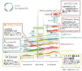 東京ソラマチについて 1.コンセプト 東京ソラマチは東京スカイツリーとともに都心と東武沿線、日本と世界とを結ぶゲートシティを目指した商業施設で、ショッピング、観光、日常使いなどさまざまな目的で訪れたお客さまに楽しんでいただけるオリジナリティあふれるバラエティ豊かな商業施設です。 東京ソラマチのコンセプトは「新・下町流」。訪れるお客さまにこの地ならではの、新しい下町の魅力を感じる商業施設を提案いたします。私たちのめざす「新・下町流」の3つの流儀は以下のとおりです。 「温故創新」・・・ 下町エリアは職人の町、モノづくりの町であり、現在も伝統を育みながら新しいモノや文化を生み出しています。この伝統を生かしながら未来に向けて新しい文化や情報をお客さまに発信します。 「Re−lax」・・・ 向島界隈は江戸と呼ばれていた頃、風光明媚なリゾート地でした。四季が感じられる並木道等、訪れるお客さまが気持ちのいい、リラックスできる空間を創ることで、人々が集い、地域の皆様に末永く愛される施設を目指します。 「ライブ!」・・・ 下町エリアは花火、お祭りなど一年を通じ、さまざまなイベントが行われる賑わいを感じるエリアです。東京ソラマチでも、皆様にお楽しみ頂けるイベントを定期的に開催し、人々を魅了し続けます。 2.フロア紹介 ※添付画像参照 |