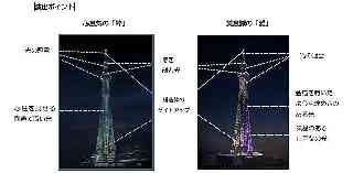 Rising East Project NEWS RELEASE http://www.rising-east.jp 2009年10月16日 東京に新しいタワーが生まれます。 東京スカイツリー(R)ライティングデザインを決定しました。 2012年春開業予定 過去と未来をつなぎ、みんなの心に届く光でありたい 東武鉄道株式会社 東武タワースカイツリー株式会社 東武鉄道(本社:東京都墨田区)と東武タワースカイツリー(本社:東京都墨田区)では、東京都墨田区業平橋・押上地区において東京スカイツリーを核とした多機能複合型の開発プロジェクトを2012年春の開業に向けて進めておりますが、このほど東京スカイツリーのライティングデザインを決定いたしました。 東京スカイツリーのライティングデザインについては、2007年8月に戸恒浩人氏(シリウスライティングオフィス代表)をライティングデザイナーに決定し、以下の基本コンセプトに基づき照明演出計画の検討を行うとともに、器具、光源、配置計画などの技術的な検証を進めてまいりました。 <基本コンセプト> ・下町〜東京〜日本へ広がる地域性 ・江戸〜現代〜未来へつながる歴史性 ・地球にやさしく環境時代にふさわしい象徴性 今回決定したライティングデザインは、江戸で育まれてきた心意気の「粋」と、美意識の「雅」という2つのオペレーションが1日毎に交互に現れる新しいスタイルのライティングで、今日に続く明日、明日の先に続く未来を表現しました。随所に江戸の原風景を継承するデザインを取り入れることでタワーの立つ下町の歴史文化を表します。 また、照らしている部分と陰になる部分が一体となって美しく感じられるライティングに取り組むとともに、最先端の照明技術を駆使し、環境時代を迎えた21 世紀にふさわしい、省エネルギーと美しさが両立するデザインとしました。地域のシンボルとして、東京スカイツリーは過去と未来をつないで輝き続けます。 なお、照明設備の基本計画および実施設計は、(株)日建設計が行っており、今後関係各所との協議等とあわせて、より具体的な設計を進めてまいります。また、具体的な照明器具仕様やメーカー等につきましては、決定次第発表させていただきます。 以上 |