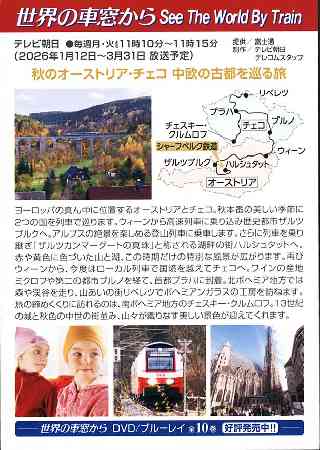 テレビ朝日 ●毎週月・火よる 11時10分〜11時15分 (2026年1月12日〜3月31日放送予定) 秋のオーストリア・チェコ 中欧の古都を巡る旅 ヨーロッパの真ん中に位置するオーストリアとチェコ。秋本番の美しい季節に2つの国を列車で巡ります。ウィーンから高速列車に乗り込み歴史都市ザルツブルクへ。アルプスの絶景を楽しめる登山列車に乗車します。 さらに列車を乗り継ぎ「ザルツカンマーグートの真珠」と称される湖畔の街ハルシュタットへ。赤や黄色に色づいた山と湖、この時期だけの特別な風景が広がります。 再びウィーンから、今度はローカル列車で国境を越えてチェコヘ。ワインの産地ミクロフや第二の都市ブルノを経て、首都プラハに到着。北ボヘミア地方では森や渓谷を走り、山あいの街リベレツでボヘミアンガラスの工房を訪ねます。 旅の締めくくりに訪れるのは、南ボヘミア地方のチェスキー・クルムロフ。3世紀の城と秋色の中世の街並み、山々が織りなす美しい景色が迎えてくれます。 「世界の車窓から」カンボジア編 制作スタッフ ●ナレーション 石丸謙二郎 ●撮 影 平林聡一郎 ●テ ー マ 曲 溝口 肇 ●技 術 井之上大輔 ●プロデューサー 小谷知輝 ●アシスタント (テレビ朝日) プロデューサー 渡部博美 岡部憲治 ●アシスタント 水谷久美 ディレクター 杉本涼輔 ●ディレクター 野口夏樹 ●撮影コーディネート アダム・ワチカージュ 「世界の車窓から」 ●テレビ朝日 https://www.tv-asahi.co.jp/train/ ホームページ ●テレコムスタッフ https://www.telecomstaff.co.jp/ 世界の車窓から DVD/ブルーレイ 全10巻 好評発売中 |