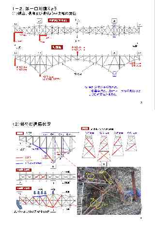 1.犀角山トンネル(参考資料 P13) 変状状況に応じた覆工補強、剥落対策を行うとともに、高森方出口から40mまでについては地山の切り取り撤去を行い、坑門を再設置する。 ・高森方40m付近においては、トンネル内に 490mm程度の横ずれが生じており、修復するためにはトンネル断面の大幅な拡幅が必要である。一方、トンネル周辺の地山及びトンネル出口斜面の地質は脆弱であること、第一白川橋りょうの復旧にあたり施工ヤードとして平場を確保しなければならないことから、トンネル出口方(高森側)の地山を切り取り撤去した上で、高森方の坑門を40mセットバックして、再設置する。また、第一白川橋りょう側の斜面については、動態観測の継続とともに、吹付枠工やグランドアンカー工による斜面補強を行う。 ・その他の箇所のうち、変状の大きい箇所については、補強対策として、ロックボルトやインバートの設置、既存内巻(鋼製支保工や吹きつけモルタル)の撤去、再構築を行う。変状の小さい箇所においては、浮き上がったコンクリートのたたき落とし、ひび割れ箇所の補修を行った上で、剥落対策としてFRP(繊維補強プラスチック)帯板及びFRPネットの設置等を実施する。 2.第一白川橋りょう(参考資料 P14) 復旧に当たっては、 ・起点方の側径間(1A−1P間)の一部の部材では、座屈変形や降伏応力に達する変形が生じており、架け替えが避けられない程の甚大な損傷を受けていこと ・上部工全体にわたり、支点の変位に伴い部材に大きな応力が発生し、特に、下弦材に引張降伏応力及び座屈応力が働いている可能性が高いことが構造解析により確認され、橋りょうの広範囲で部材の耐力が低下している可能性が高いこと ・仮に各部材を補強や交換する場合、支点変位による部材にかかる応力を解放した後、部材の残留応力や残存耐力を評価する必要があり、これに非常に多くの時間を要すること等の理由により、早期復旧を図る観点からは、上部工全体を架け替えざるを得ない と考える。 復旧に当たっては、以下の手順で進めることとなる。 @施工ヤードの整備 犀角山トンネルの出口方(高森側)地山を切り取り撤去し、橋りょう架け替え工事のための施工ヤードを整備する。 A斜面の補強及びブロックの設置工事 崩壊した斜面を補強するとともに、橋りょう撤去の準備作業として、橋りょうの下弦材を支えるブロックを斜面上に設置する。 B橋りょう下部工の補強工事 損傷した橋りょうの下部工(基礎部)を補強するため、コンクリート及び増し杭(マイクロパイル)を打設する。 C鉄塔及びケーブルの設置工事 橋りょう撤去の準備作業として、上弦材を支える鉄塔及びケーブルを設置するとともに、橋りょうの部材を撤去するためのワイヤー式つり上げクレーンを設置する。 D橋りょう部材の撤去 E橋りょうの新設 ・橋りょうの下部工については、基礎部に対する補強を行えば、上部工を支持するのに必要な性能まで回復できるものと考えられる。 3.戸下トンネル(参考資料 P15) 変状状況に応じた覆工補強、剥落対策、トンネル全長にわたる排水溝の再構築をそれぞれ実施する。 ・トンネル入口から約60m付近までは、大きな変状や覆工背面に空洞が見受けられることから、内巻、ロックボルト、裏込め注入を実施する。 ・その他の箇所においては、浮き上がったコンクリートのたたき落としやひび割れ箇所の補修を行った上で、剥落対策としてFRP帯板及びFRPネットの設置等を実施する。 ・トンネル全長にわたり、中央にある排水溝の撤去、再構築を行うとともに、道床交換を実施する。 ・第一白川橋りょう側の斜面については、トンネル坑口の上方、下方を含めて一体的な対策(石積擁壁の改修や吹付工等)が必要と考えられる。 4.立野橋りょう(参考資料 P10) 1P〜4Pの各橋脚について、以下の通り補修を行う。 1P:橋脚の全周を鋼板による巻き立て 2P:基礎コンクリートの拡幅、アンカーの再設置 3P、4P:ひび割れ箇所、ブロックが浮いている箇所に鋼板を当てて補修 5.斜面・擁壁(参考資料 P11) ・石積み擁壁については、ブロック積み擁壁に再構築する。なお、軽微なものについては鋼材で固定する。 ・崩壊した斜面については吹付枠工を、落石が懸念される箇所には落石防護柵等の設置を行う。 6.長陽駅〜中松駅間(参考資料 P12) ・被害の大きい 2箇所の盛土は、現盛土を撤去して、良質土を用いて安定勾配(斜面の崩壊が生じにくい勾配)により再構築する。その他、軌道陥没箇所の復旧や軌道整正等を実施する。 Y.復旧見通し・復旧費用 X.の復旧方法を前提として設計・工事が実施された場合の復旧見通し(設計・工事期間)及び復旧費用(概算)について検討したところ、以下の通りの結果となった。 最も復旧に時間を要するのは第一白川橋りょうの5年程度となっている。これは、架け替えが必要となるとともに、その前工程として、施工ヤードの整備等犀角山トンネルの工事を先行して実施する必要があるためである。 復旧費用については、全体