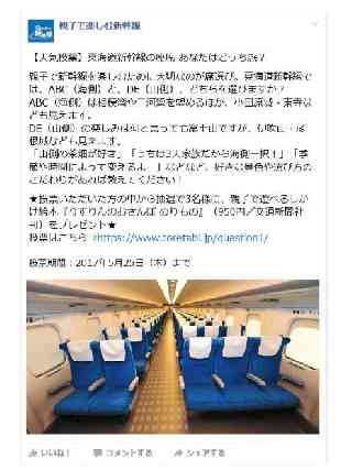 4.Facebook ページでの新たな記事の配信について 親子の皆様に、より東海道新幹線に親しんでいただこうと開始した「親子で楽しむ新幹線Facebook ページ」にて、一層お楽しみいただけるような新たなテーマで記事を配信します。 1.記事の内容 @新幹線の車窓から見る風景や新幹線ビュースポットを紹介します ・新幹線の車窓から見る風景写真や、走行する新幹線を見られるビュースポットからの写真を掲載し、撮影場所やアクセス等の解説を添えます。 A親子旅におすすめの沿線スポットや旅行商品を紹介します ・東海道新幹線の沿線で、親子旅におすすめの目的地や親子で遊べるスポット等を紹介し旅行商品も紹介します。 B「親子」・「新幹線」に関するエピソード及び写真を募集・紹介します ・「親子」・「新幹線」に関するテーマを設定し、エピソードや写真を募集します。 その中から数点を大賞、優秀賞としてFacebook 内で発表します。 受賞者には景品をプレゼントします。 C新幹線にまつわる人気投票を実施します ・アンケート形式で東海道新幹線にまつわる人気投票を実施します。 お答えいただいた方の中から抽選で景品をプレゼントします。 2.記事の一例 ※添付画像参照 ※本掲載画像はすべてイメージです。 |