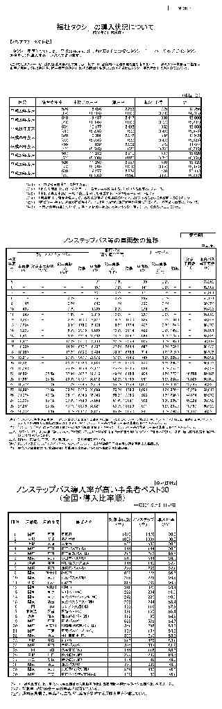 国土交通省 Press Release Ministry of Land,Infrastructure,Transport and Tourism 平成30年12月14日 自動車局旅客課 バス・タクシー車両やバスターミナルのバリアフリー化が着実に進捗 〜平成29年度末 自動車交通関係移動等円滑化に関する実績の調査結果概要〜 自動車交通における平成29年度末のバリアフリー化の主な実績は、ノンステップバス車両数が対前年度7.2%増加の26,002台、バスターミナルの段差が解消されている施設数が86施設、福祉タクシー車両数が対前年度4,985台増加の20,113台となっており、着実に進捗しています。 平成18年12月に「高齢者、障害者等の移動等の円滑化の促進に関する法律」(バリアフリー法)が施行されたことを受け、バス、タクシー等の各事業者による車両や施設の一層のバリアフリー化が求められているところです。 こうした状況を踏まえ、この度、平成29年度末における乗合バス、バスターミナル及び福祉タクシーの移動等円滑化実績等について、調査を実施し、その結果概要をとりまとめました。 国土交通省では、ノンステップバスの導入等に対して補助等による支援措置を実施するとともに、ノンステップバスの標準仕様の改定により普及促進を図るなど、今後も引き続き、公共交通のバリアフリー実現のための取組みを推進していきます。 平成29年度末自動車交通における主なバリアフリー化の進捗状況 ()内は前年度比 ■乗合バスのバリアフリー化について[別紙1] ノンステップバス56.4%(約3.0ポイント増加)、リフト付きバス5.9%(約0.1ポイント増加) ■バスターミナルのバリアフリー化について[別紙2] 1日当たりの利用者数が3千人以上の施設93.6%(約2.3ポイント増加) ■福祉タクシーの導入状況について[別紙3] 福祉タクシー20,113台(4,985台増加) <参考> ■ノンステップバス等の車両数の推移[参考資料1] ■ノンステップバス導入率が高い事業者ベスト30[参考資料2] ■都道府県別移動円滑化基準適合車両導入状況[参考資料3] ■全国乗合バス事業者の移動円滑化基準適合車両導入状況[参考資料4] *伊藤注:[参考資料4]は省略します。次のURLでご覧下さい。 http://www.mlit.go.jp/common/001265044.pdf なお、公共交通機関全体におけるバリアフリー整備状況は、総合政策局ホームページに掲載しています。 (URL:http://www.mlit.go.jp/sogoseisaku/barrierfree/sosei_barrierfree_mn_000003.html) |