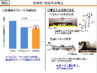 2019年1月25日 東海旅客鉄道株式会社 次期新幹線車両「N700S」量産車の仕様および投入計画について 次期新幹線車両「N700S」は、これまで積み上げてきた技術開発の成果を取り入れ、安全性・安定性の向上、異常時対応力の強化、快適性・利便性の向上、様々な編成長を容易に構成できる「標準車両」等の特長を有しています。 これまでのN700S確認試験車による走行試験結果を踏まえ、2020年度からN700系の置き換えとして投入する量産車の仕様および投入計画を決定しましたのでお知らせします。また、営業運転の開始時期は、2020年7月を予定しています。 1.量産車の主な仕様 (1)安全性・安定性の向上【別紙1、2】 @地震時のブレーキ距離短縮 ATCとブレーキシステムを改良し、地震時のブレーキ距離をN700Aタイプから5%短縮します。 A着雪防止対策の強化 台車カバーの形状変更や融雪ヒーター等の着雪防止対策を採用し、列車遅延を低減します。 B状態監視機能の強化 大容量のデータ通信を実現し、これまでより詳細な機器データを車両データ分析センターに集約します。これらのデータを用いて、より高精度に各機器のモニタリングを実施し、故障の予兆の段階で調査修繕を行うことで、未然に故障を防止します。 また、将来の検修作業の省力化にも活用します。 (2)異常時対応力の強化【別紙3、4】 @バッテリ自走システムの搭載 バッテリ自走システムを高速鉄道で初めて搭載し、自然災害等による長時間停電時においてもお客様の避難が容易な場所まで自力走行が可能となります。 A防犯カメラの増設 N700Aタイプの防犯カメラ設置箇所に加え、客室の天井にもカメラを設置し、車内におけるセキュリティを強化します。 B通話装置の機能強化 緊急時にお客様と乗務員が通話できる装置を、指令所の係員とも通話ができるように改良します。また、装置を増やすとともに、お客様に分かり易い客室内に設置し、異常時の即応体制を強化します。 C停電時におけるトイレ機能の確保 自然災害等で長時間停電した場合でも一部トイレの使用を可能にします。 (3)快適性・利便性の向上【別紙5】 @フルアクティブ制振制御装置の搭載 より制振性能の高い「フルアクティブ制振制御装置」をグリーン車、先頭車およびパンタグラフ搭載号車に搭載することで、乗り心地を向上します。 Aモバイル用コンセントの増設 モバイル用コンセントを全座席に設置し、利便性を向上します。 (4)ランニングコストの低減【別紙6】 @消費電力量の削減 走行抵抗を低減した先頭形状(デュアル スプリーム ウィング形)の採用や次世代半導体「SiC素子」の駆動システムへの採用により、消費電力をN700Aタイプから6%削減します。 A検修作業の省力化 パンタグラフやブレーキ装置の摩耗部品を長寿命化し、交換周期を約2倍に延伸することで、検修作業の省力化を実現します。 2.投入計画 ┌───┬────┬────┬────┬──┐ | 年度 |2020|2021|2022| 計 | ├───┼────┼────┼────┼──┤ |編成数| 12 | 14 | 14 |40| └───┴────┴────┴────┴──┘ 3.工事費 約2,400億円(車両製作費用、補修部品の費用等) 4.その他 ・N700Sの一部の編成には、次期軌道状態監視システムを搭載します。 ・既存のN700AタイプにN700Sの一部機能を追加する改造工事を実施します。 ※「4.その他」に記載した工事の費用は、「3.工事費」に含まれていません。 |
