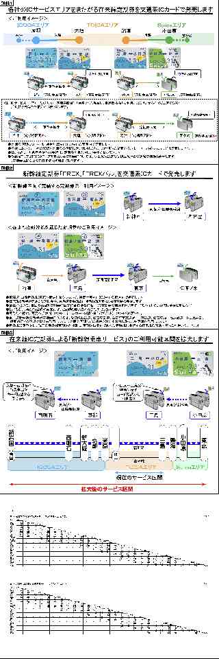 2019年9月20日 東日本旅客鉄道株式会社 東海旅客鉄道株式会社 西日本旅客鉄道株式会社 在来線および新幹線におけるIC定期券のサービス向上について 東日本旅客鉄道株式会社、東海旅客鉄道株式会社および西日本旅客鉄道株式会社は、3社で協力して、在来線および新幹線におけるIC定期券のサービス向上を図ります。ますます便利になるIC定期券を、ぜひご利用ください。 1.サービス内容 (1)各社のICサービスエリアをまたがる在来線定期券を交通系ICカードで発売します(別紙1) ・「SuicaエリアとTOICAエリア」「TOICAエリアとICOCAエリア」をまたがる区間の在来線定期券を、Suica、TOICA、ICOCAで発売します。 ・各社のICサービスエリアをまたがって通勤・通学される定期券利用のお客さまも、自動改札機にタッチするだけで改札を通過でき、紛失時の再発行も可能になります。 ※各社のICサービスエリアをまたがり、かつ定期券区間外を乗車される場合は、自動改札機を利用できませんので、ご注意ください。 ※交通系ICカードのチャージ額を利用し、各社のICサービスエリアをまたがって乗車される場合は、これまでと同様に、自動改札機をご利用いただけませんので、あらかじめ全乗車区間のきっぷをお買い求めください。 ※TOICAのサービスエリアを熱海、国府津、米原の各駅まで拡大します。これにより、熱海・国府津・米原〜TOICAエリア間を乗車される場合においても、自動改札機をご利用いただけるようになります。 (2)新幹線定期券「FREX」「FREXパル」を交通系ICカードで発売します(別紙2) ・東海道・山陽新幹線(東京〜新岩国間)の定期券を、これまでの磁気定期券に加え、Suica、TOICA、ICOCAで発売します。 ・東海道・山陽新幹線で通勤・通学される定期券利用のお客さまも、自動改札機にタッチするだけで改札を通過でき、紛失時の再発行も可能になります。 ※現在の新幹線定期券と同様に、在来線と新幹線を通じた定期券や、東海道新幹線と山陽新幹線をまたがる定期券も発売します。 ※新幹線IC定期券は、現在の新幹線定期券と同様に、新幹線に並行する在来線もご利用いただけます。 (3)在来線IC定期券による「新幹線乗車サービス」(*)のご利用可能区間を拡大します(別紙3) ・在来線IC定期券((1)の定期券も含みます)による「新幹線乗車サービス」が、東海道・山陽新幹線(東京〜新岩国間)でご利用いただけるようになります。 (*)定期券区間内に新幹線停車駅が2駅以上含まれる在来線IC定期券を、新幹線自動改札機にタッチしていただくだけで定期券区間内の新幹線(普通車自由席)に乗車できるサービス。(特急料金は、新幹線降車駅の自動改札機でチャージ額から引き去ります) 2.サービス開始時期 2021年春 (サービスの開始日や詳細は、決まり次第お知らせします) |