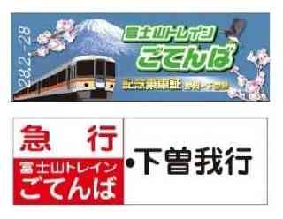 ○臨時急行「富士山トレインごてんば号」の運転 ・静岡駅から乗り換えなしで御殿場駅・下曽我駅を結びます。 ・「小田原梅まつり」会場の最寄駅(下曽我駅)に、「さわやかウォーキング」(2月28日御殿場駅スタート)はもちろん、冬の御殿場散策やお買い物にもおすすめです。 ◆運転日時:平成28年2月27日(土)、28日(日) 上り 静岡駅 8:33発 → 下曽我駅10:52着 下り 下曽我駅15:49発 → 静岡駅 18:20着 ◆運転区間:静岡駅〜下曽我駅(1日1往復) ◆停車駅:清水駅、富士駅、東田子の浦駅、沼津駅、御殿場駅、山北駅、松田駅 ※停車駅は、上り・下りとも同じです。 ◆運転時刻 ┌──────────┬──────────┐ | 下曽我行き(上り) | 静岡行き(下り) | ├──────┬───┼──────┬───┤ |静岡 発| 8:33|下曽我 発|15:49| |清水 発| 8:42|松田 発|16:06| |富士 発| 9:02|山北 発|16:23| |東田子の浦発| 9:22|御殿場 発|16:49| |沼津 発| 9:40|沼津 発|17:30| |御殿場 発|10:10|東田子の浦発|17:39| |山北 発|10:33|富士 発|17:47| |松田 発|10:44|清水 発|18:09| |下曽我 着|10:52|静岡 着|18:20| └──────┴───┴──────┴───┘ ◆車両:373系(全席指定:3両編成)※一部のコンパートメント席は発売しません。 ◆運賃等(単位:円) 臨時急行列車「富士山トレインごてんば号」は全車指定席です。ご乗車の際、乗車券の他に急行券・指定席券が必要です。乗車前にお買い求めください。 上段 : 運賃 中段 : 急行/指定席料金 ┌───┬───┐ | 駅名 | 静岡 | ├───┼───┼───┐ |清水 | 240| 清水 | | | 1,070| | ├───┼───┼───┼───┐ |富士 | 580| 410| 富士 | | | 1,070| 1,070| | ├───┼───┼───┼───┼───┐ |東田子| 760| 580| 200|東田子| |の浦 | 1,070| 1,070| 1,070|の浦 | ├───┼───┼───┼───┼───┼───┐ |沼津 | 970| 760| 320| 240| 沼津 | | | 1,270| 1,070| 1,070| 1,070| | ├───┼───┼───┼───┼───┼───┼───┐ |御殿場| 1,320| 1,140| 760| 670| 410|御殿場| | | 1,270| 1,270| 1,070| 1,070| 840| | ├───┼───┼───┼───┼───┼───┼───┼───┐ |山北 | 1,660| 1,490| 1,140| 970| 760| 320| 山北 | | | 1,270| 1,270| 1,270| 1,270| 1,070| 840| | ├───┼───┼───┼───┼───┼───┼───┼───┼───┐ |松田 | 1,940| 1,660| 1,140| 1,140| 840| 500| 190| 松田 | | | 1,500| 1,270| 1,270| 1,270| 1,070| 840| 840| | ├───┼───┼───┼───┼───┼───┼───┼───┼───┼───┐ |下曽我| 1,940| 1,660| 1,320| 1,140| 970| 580| 240| 200|下曽我| | | 1,500| 1,270| 1,270| 1,270| 1,270| 1,070| 1,070| 1,070| | └───┴───┴───┴───┴───┴───┴───┴───┴───┴───┘ ◆発売日 急行券・指定席券は、ご乗車になる日の1ヶ月前の10時から、全国のJRの主な駅・旅行会社の窓口で発売します。 ◆その他 ・「富士山トレインごてんば」号を利用した旅行商品の設定はありません。ご了承ください。 ・荒天の場合等は、列車の運行を中止する場合があります。当日の運行状況はJR 東海テレフォンセンターにお問合わせください。(JR 東海テレフォンセンター:050-3772-3910 サービス番号2) ・列車が運転できない場合は、乗車券と急行券・指定席券を全額無手数料で払い戻します。 ◆装飾等 専用ヘッドマーク、専用座席カバーを設置します。 ◆特典 ご乗車の方に沼津駅〜御殿場駅間の車内で「記念乗車証」を配布(おひとり様1枚)します。 (上り、下りでデザインの異なる記念乗車証を配布します) ◆コンパートメント席での物販等 車両のコンパートメント席で物販や各自治体の観光PR等を実施します。 【御殿場市ゾーン】:御殿場市のイメージガール富士娘などによる観光PRを予定 【物販ゾーン】:車内限定発売の鉄道グッズ、御殿場の地ビールやおつまみ類の販売 ◆駅でのイベント(いずれも上り列車のみ) 富士山が眺望できる東田子の浦駅ホームで停車時間中(約12分間)に「富士娘」と記念撮影ができます。「乗車記念ボード」もご用意していますので、是非、撮影をお楽しみください。 御殿場駅で下車されたお客様には、マスコットキャラクター「ミクリン」のお出迎えと、御殿場市や御殿場市観光協会によるお茶のサービス、下曽我駅で下車されたお客様には「寿獅子舞」(27日のみ)のお出迎えと、曽我まつり実行委員会などによる梅干の提供があります。 ※お茶や梅干しの提供サービスは、なくなり次第終了いたします。 ※富士山は気象状況等によりご覧いただけない場合があります。 ◆さわやかウォーキングの開催 2月28日(日)は御殿場駅スタートのさわやかウォーキング「〜富士山ビュー〜雪景色の富士山眺望とウイスキー蒸溜所を訪ねて」を開催します。 参加特典として先着1,000名様に、「富士山バッジ」をプレゼントします。 ※掲載のコース詳細については、さわやかウォーキングのパンフレットまたはJR東海のホームページ(http://walking.jr-central.co.jp)をご覧ください。 ※富士山は気象状況等により