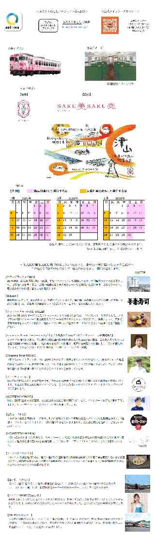 〜SAKU美SAKU楽の販売方法について〜 1 販売方法について 特製弁当またはスイーツ等のお食事や途中停車駅でのお土産品をはじめとした車内サービスときっぷをセットにして、せとうち観光ナビ「setowa」や、全国の主な旅行会社で販売します。車内サービスで提供するお弁当やお土産品は、列車により異なります。(みどりの窓口、みどりの券売機、e5489等では販売いたしません。) (1)車内サービス・おもてなし内容(提供品) 車内アテンダントが、沿線の案内や列車の旅をサポートします。ご乗車のお客様には、特製弁当またはスイーツと、途中停車駅で沿線のお土産を提供し、地元の魅力をお届けします。 <販売価格に含まれるもの> 運賃、指定席料金、提供品(下表「提供品」欄の番号と同じ) ※詳細別添 特製弁当・スイーツ @ホテルグランヴィア岡山監修特製弁当 岡山美作かえし寿司 A岡山のスイーツセット フルーツタルトと季節のプリンアラモード B寺田シェフ監修特製弁当 岡山県北イロドリちらし 沿線のお土産品 C福の町たけべ「福の袋」 〜福渡のいいもの詰め合わせ〜 Dプチゆずミルクセーキ Eアイデア料理研究家 makoさん監修スイーツ (2)「setowa」での販売価格(片道) 【岡山発】岡山→津山 ┌──────────┬──┬───┬───┬────┬────┬───┐ │ │列車│岡山発│津山着│ おとな │ こども │提供品│ ├──────────┼──┼───┼───┼────┼────┼───┤ │ 金・土・日曜日 │2号│10:50│12:22│ 6,000円│ 5,140円│ @C │ │臨時列車(1両編成)│4号│14:33│15:51│ 5,200円│ 4,340円│ AC │ ├──────────┼──┼───┼───┼────┼────┼───┤ │ 月曜日 │2号│ 9:47│10:59│ 5,200円│ 4,340円│ AC │ │ 定期列車に連結 │4号│13:05│14:14│ 6,000円│ 5,140円│ @C │ └──────────┴──┴───┴───┴────┴────┴───┘ 【津山発】津山→岡山 ┌──────────┬──┬───┬───┬────┬────┬───┐ │ │列車│津山着│岡山発│ おとな │ こども │提供品│ ├──────────┼──┼───┼───┼────┼────┼───┤ │ 金・土・日曜日 │1号│12:52│14:12│ │ │BDE│ ├──────────┼──┼───┼───┤ │ ├───┤ │臨時列車(1両編成)│3号│16:21│18:17│ 6,000円│ 5,140円│ │ │ 月曜日 │1号│11:40│12:50│ │ │ BC │ │ 定期列車に連結 │3号│15:53│17:02│ │ │ │ └──────────┴──┴───┴───┴────┴────┴───┘ ※岡山・津山以外の駅では乗降できません (3)発売期間 運行日の1カ月前の 10時から7日前まで (4)発売窓口 せとうち観光ナビ「setowa」または全国の主な旅行会社 ※7月1日の2号は、旅行会社のみで発売します。 この他、旅行会社のみでの発売等、「setowa」で発売しない場合があります。 せとうち観光ナビ「setowa」とは、せとうちエリアの話題のスポットの紹介や、スポットまでの経路検索および経路検索から新幹線やレンタカーの予約機能等、JR西日本が提供するせとうち旅に欠かせない「観光ナビ」です。 JRやバス、船舶等指定の公共交通機関の自由周遊エリアが乗り放題の大変おトクな setowa限定「周遊パス」や、せとうちで人気のサイクリングの予約や経路検索、旅ナカでのタクシー配車機能等、せとうちの観光・体験・移動をキャッシュレス・チケットレスで安心・便利に、おトクに楽しんでいただけます。 (5)旅行会社での取り扱い SAKU美SAKU楽の乗車プランや、JR往復きっぷと宿泊をセットにしたお得な旅行プランを、全国の主な旅行会社で販売予定です。詳細は各社HPをご確認いただくか、各旅行会社へお問合せ合わせください。 2 その他 ・列車でのお楽しみについて、次回のお知らせを6月頃に予定しています。 ・「SAKU美SAKU楽」の情報を、JR岡山支社ふるさとおこしプロジェクト公式HP内に掲載し、新たな情報を随時更新します。 ・その他情報についても、JR岡山支社「くまなく・たびにゃん (JR岡山支社 )」公式ツイッター等での発信を予定しています。 ・情報はすべて、2022年5月現在のものです。内容は、予告なく変更する場合があります。 <ふるさとおこしプロジェクト公式HP> ふるさとおこしで検索 https://jr-furusato.jp/ <公式ツイッターアカウント> 公式ツイッター くまなく・たびにゃん (JR岡山支社)【公式】 @Okayama_JR (参考) 1 列車コンセプト 〜岡山県北エリアをめぐる、美しきを作る旅〜 ◎名湯・美作三湯(みまさかさんとう)や桜の名所等豊かな自然が旅心を誘う、岡山県北エリア。自然が生み出す産物や脈々と息づく文化・伝統、おもてなしに触れ、身体も心もあたたかく美しきを作る旅へといざないます。 ◎岡山県北エリアへの旅のエントランスとして、地域の食や周遊アクセスで岡山駅から旅を盛り上げます。 2 列車名 「SAKU美SAKU楽」(読み:さくびさくら) <列車名に込められた思い> 全国から 500件以上
