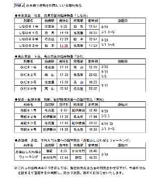 ◆中央本線 松本、白馬方面の臨時特急「しなの」 ┌──────┬───┬───┬───┬───┬────┐ │ 列車名 │始発駅│発時刻│終着駅│着時刻│ 運転日 │ ├──────┼───┼───┼───┼───┼────┤ │しなの81号│名古屋│ 8:29│白 馬│11:57│4/29 │ │しなの84号│白 馬│14:49│名古屋│18:33│5/1,3〜5│ │しなの85号│名古屋│10:29│松 本│12:57│4/29 │ │しなの82号│松 本│15:01│名古屋│17:20│5/1,3〜5│ └──────┴───┴───┴───┴───┴────┘ ◆高山本線 下呂、高山方面の臨時特急「ひだ」 ┌──────┬───┬───┬───┬───┬────┐ │ 列車名 │始発駅│発時刻│終着駅│着時刻│ 運転日 │ ├──────┼───┼───┼───┼───┼────┤ │ひだ 81号│名古屋│10:18│高 山│12:58│4/14 │ │ひだ 82号│高 山│17:33│名古屋│20:02│5/3 │ ├──────┼───┼───┼───┼───┼────┤ │ひだ 83号│名古屋│13:38│高 山│16:23│4/14 │ │ひだ 98号│高 山│20:52│名古屋│23:32│ │ └──────┴───┴───┴───┴───┴────┘ ◆関西・紀勢本線 熊野、紀伊勝浦方面への臨時特急「南紀」 ┌─────┬────┬───┬────┬───┬────┐ │ 列車名 │ 始発駅 │発時刻│終着駅 │着時刻│ 運転日 │ ├─────┼────┼───┼────┼───┼────┤ │南紀81号│名古屋 │ 8:51│紀伊勝浦│12:49│4/29 │ │南紀82号│紀伊勝浦│13:38│名古屋 │17:44│5/3,5 │ ├─────┼────┼───┼────┼───┼────┤ │南紀83号│名古屋 │16:43│紀伊勝浦│20:32│4/29,30 │ │南紀84号│紀伊勝浦│14:29│名古屋 │18:26│5/1,3〜5│ └─────┴────┴───┴────┴───┴────┘ |