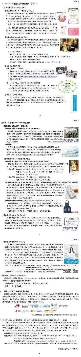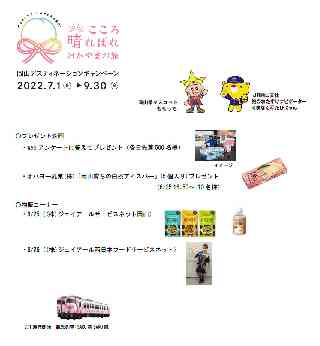 2022年6月20日 岡山デスティネーションキャンペーン推進協議会 西 日 本 旅 客 鉄 道 株 式 会 社 岡山デスティネーションキャンペーン推進協議会とJRグループが開催する「岡山デスティネーションキャンペーン(以下、岡山DC)」がまもなくはじまることに先立ち、大阪にて観光PRイベントを実施します。当イベントを「関西エリアにおける岡山DCのオープニング」と位置づけてセレモニーを行うほか、以下のとおり企画をご用意します。 「晴れの国おかやま」の豊かな自然や魅力的なアート、朝と夜の楽しみ方や旬のフルーツをテーマにした体験など、夏のご旅行の情報収集に、是非お立ち寄りください。 1.イベント名 岡山デスティネーションキャンペーン岡山県観光PRイベント 2.日 時 2022年6月25日(土)11:00〜17:00 26日(日)10:00〜16:00 3.場 所 JR大阪駅大阪ステーションシティ2階アトリウム広場 (大阪府大阪市北区梅田3−1) 4.内 容 ○開会セレモニー(6/2511:00〜11:20頃) 主催者からのご挨拶および「鏡開き」を模したセレモニーを実施します。セレモニー後は岡山自慢の清水白桃を使用したドリンクを配布します。 ・主催者挨拶 岡山県産業労働部長 三浦智美 西日本旅客鉄道株式会社営業本部担当部長 梶浦剛史 ・鏡開きおよび白桃ドリンクの振る舞い(先着50名様) ○観光PRステージ(各日2回) 地元スタッフがキャンペーンのいちおし企画や旬な情報、おすすめ旅行商品のご紹介を行います。また、一部時間帯ではご当地キャラクターたちが登場し、ダンスの披露も行います。 ※会場には、PRステージ参加自治体以外の観光パンフレット等も配架しています。 ・6/25のPRステージ(各回1時間半程度) 1回目12:15〜 2回目14:45〜 【観光PR】倉敷市、玉野市、井原市、新見市、瀬戸内市など ・6/26のPRステージ(各回1時間程度) 1回目11:15〜 2回目13:45〜 【観光PR】津山市、赤磐市など ○プレゼント企画 どなたでもご参加いただけるプレゼント企画を実施します。 ・webアンケートに答えてプレゼント(各日先着500名様) 会場内にある2次元コードをお手持ちのスマートフォンで読み込み、簡単なwebアンケートにお答えいただいた方へ、くじ引きで素敵な賞品をプレゼントします。 ・オハヨー乳業(株)「岡山育ちの白桃アイスバー」(5個入り)プレゼント(6/2516:50〜10名様) 岡山DCにあわせて開発された発売前の新商品を10名様にプレゼントするじゃんけん大会を行います。時間にあわせてイベント会場周辺へお越しください。 ※ドライアイス入りの発泡ボックスでの進呈となります。進呈後の一時預かり等は致しかねます。 ※進呈後にその場でお召し上がりになることはお控えいただき、お持ち帰りにご協力をお願いいたします。 ○物販コーナー 地産品を用いた商品やドリンク、おみやげとして人気の雑貨や地元銘菓などを会場で販売します。 ・6/25((株)ジェイアールサービスネット岡山) JR岡山支社が地域の企業や生産者と協働し開発した「JR PREMIUM SELECT SETOUCHI」シリーズ(※)や、地元自慢の銘菓など、岡山・備後エリアの人気商品を販売します。岡山DCの開催にあわせて発売を開始した新商品もございます。 ※詳細は「ふるさとおこしプロジェクト」公式HP(https://jr-furusato.jp/)をご覧ください。 ・6/26((株)ジェイアール西日本フードサービスネット) 岡山DCの開催にあわせて山陽新幹線「のぞみ号(早朝・深夜など一部列車は対象外)」の車内販売にて実施する「岡山・せとうちフェア」の商品などから、お菓子やおつまみ、山陽新幹線コラボの雑貨などを販売します。フェア期間中、車内販売のパーサーが着用する児島ジーンズブランド「BettySmith(ベティスミス)」製のオリジナルサロン(エプロン)を、当コーナーの販売スタッフが着用します。 <参考> 岡山DC開催にあわせ、7月1日にJR岡山駅でオープニングセレモニーを実施します。ただし、式典エリアへのお立ち入りについては、報道関係者を除く一般の方のご見学を制限させていただく予定のため、ご了承ください。 <岡山DCキャンペーンサイト> 岡山観光WEB(https://www.okayama-kanko.jp) 岡山観光 [検索] JRおでかけネット(https://www.jr-odekake.net/navi/okayama_dc/) あなたと晴れの日 [検索] <岡山DCプレスリリース(5/26)> https://www.westjr.co.jp/press/article/2022/05/page_20057.html |