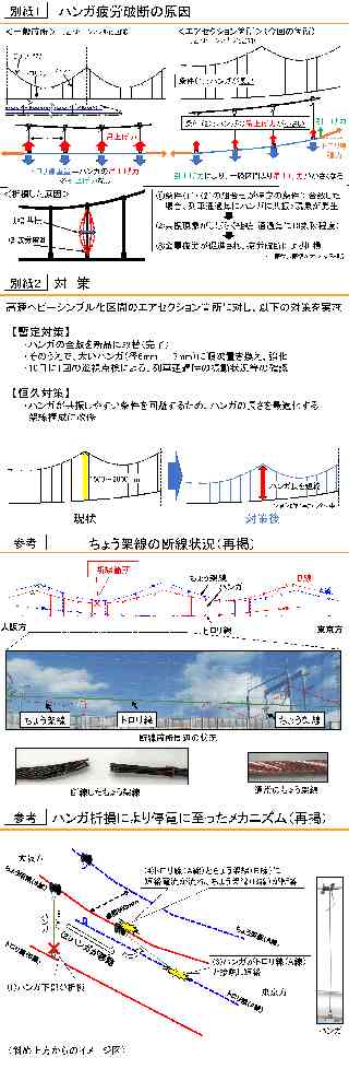 東海旅客鉄道株式会社 東海道新幹線 豊橋駅〜三河安城駅間下り線におけるちょう架線断線の原因について 令和4年12月18日に東海道新幹線豊橋駅〜三河安城駅間下り線において発生したちょう架線断線について調査を行っておりましたが、このたび、詳細が明らかになりましたので、その原因と対策をお知らせします。 1.概況 12時58分、豊橋駅〜三河安城駅間下り線のちょう架線が断線したことにより、豊橋駅〜名古屋駅間上下線にて停電が発生したため、同区間の上下線で運転を見合わせました。復旧作業を行い、17時00分に運転を再開しました。 2.原因 ちょう架線断線の原因は、ハンガの下部が金属疲労により折損し、エアセクション内でハンガが移動し、そのハンガを介して別のトロリ線とちょう架線が短絡したためです。 また、ハンガが折損した原因は、高速ヘビーシンプル化した区間のエアセクション箇所において、ハンガの長さや吊上げ力が特定の条件に合致したことで、ハンガの振動の振幅が大きくなる「共振」という現象が列車通過毎に発生し、金属疲労が促進されたためです。(別紙1) 3.対策 高速ヘビーシンプル化した区間のエアセクション61箇所において、以下の対策を行います。(別紙2) (1)暫定対策 ・ハンガの全数を新品に取替(完了) ・そのうえで、太いハンガ (径6mm→7mm)に順次置き換え、強化 ・10日に1回の巡視点検による、列車通過時の振動状況等の確認 (2)恒久対策 ・ハンガが共振しやすい条件を回避するため、ハンガの長さを最適化する架線構成に改修 ※トロリ線:車両に電力を供給する線 ※ハンガ:トロリ線を吊るための金具 ※ちょう架線:トロリ線を吊っている線 ※エアセクション:架線を電気的に区分する箇所 ※高速ヘビーシンプル化:ちょう架線・補助ちょう架線・トロリ線の3本の線で構成される従来のヘビーコンパウンド架線から、補助ちょう架線のない2本の線で構成される高速ヘビーシンプル架線に置き換えること |