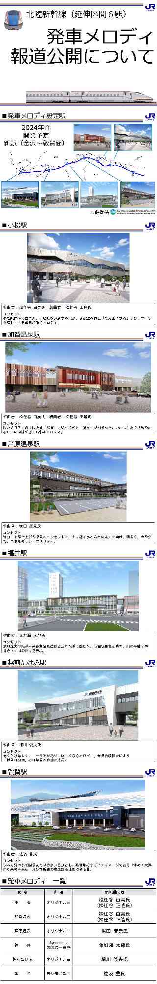 2023年 3月10日 西日本旅客鉄道株式会社 北陸新幹線(延伸区間6駅)発車メロディの決定について 2024年春に金沢〜敦賀間が延伸開業する北陸新幹線の発車予告音について、関係自治体の皆様と地元にゆかりのあるメロディの導入を検討してまいりましたが、以下のとおり決定しましたので、お知らせ致します 1.発車メロディ 小松駅 オリジナル曲 ○松任谷由実氏、松任谷正隆氏が制作 ○小松駅に降り立つ人、小松駅を通過する人が、ふと空を見上げて元気になるような、マーチを感じさせる勇気が湧くメロディ。 加賀温泉駅 オリジナル曲 ○松任谷由実氏、松任谷正隆氏が制作 ○短いメロディの中にある「加賀」という響きと「温泉」が相まった、いかにも雅で秘めやかな日本の風情が感じられるメロディ。 芦原温泉駅 オリジナル曲 ○作曲家・堀田庸元氏(あわら市出身)が制作 ○竹田川や湧き上がる温泉をコンセプトに、光り輝くあわら市の未来に向け、明るく、爽やかで、エネルギッシュなメロディ。 福井駅 Symphonic「悠久の一乗谷」 ○葉加瀬太郎氏が制作 ○葉加瀬太郎氏が一乗谷朝倉氏遺跡を訪れた際に感じた、明媚な景色と時間、山の手触りや谷を吹く風の香りを表現。 越前たけふ駅 オリジナル曲 ○現代音楽作曲家・細川俊夫氏が制作 ○聴くたび楽しく、ユーモアがあり、嬉しくなるメロディ。音響合成技術により「越前打刃物」の打撃音を作曲に活用。 敦賀駅 来い来い敦賀 (オリジナル曲) ○作曲家・佐淡豊氏が制作 ○明るく爽やかで聞きあたりのよい音調とし、敦賀駅のデザインイメージである「煌めく大海から未来へ飛翔」及び新幹線の疾走感を連想できる曲。 2.使用開始日 2024年春(開業にあわせて使用開始します) |