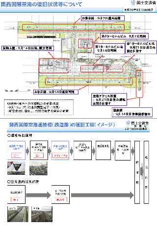 国土交通省 PressRelease MinistryofLand,Infrastructure,TransportandTourism 平成30年9月13日 航 空 局 鉄 道 局 関西国際空港の第1ターミナル北及び空港アクセス鉄道の 再開時期について 〜空港アクセスを含めた機能回復を進めます〜 ○9月21日(金)を目途に、関西国際空港の第1ターミナル北の再開を目指します。 ○空港アクセス鉄道については、明日行われる2基目の道路桁の撤去後に、鉄道桁の健全性等を調査し、問題が無いことが確認されれば、21日目途での運転再開を目指して鋭意復旧工事を進める予定です。 (参考)9月13日現在の関西国際空港の復旧状況等 別紙の通り |