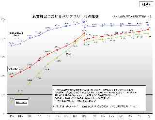 国土交通省 Press Release Ministry of Land,Infrastructure,Transport and Tourism 平成30年12月12日 総合政策局安心生活政策課 公共交通機関におけるバリアフリー化が着実に進捗! 〜平成29年度末公共交通移動等円滑化実績等報告書の集計結果概要〜 平成29年度における公共交通機関の旅客施設・車両等のバリアフリー化の主な実績は、1日当たりの平均的な利用者数が3千人以上の旅客施設において、エレベーター等による段差解消が昨年度より約2.2ポイント増加し、車両等においてはノンステップバスが約3.0ポイント増加するなど、バリアフリー化は着実に進捗しています。 「高齢者、障害者等の移動等の円滑化の促進に関する法律施行規則」第23条に基づいて公共交通事業者等は国土交通大臣に対し、旅客施設及び車両等のバリアフリー化の状況を報告することとされています。この度、公共交通事業者等から提出された移動等円滑化実績等報告書の集計結果(平成29年度末時点)をとりまとめましたのでお知らせいたします。 公共交通機関におけるバリアフリー化の進捗状況(平成29年度末) ▲全旅客施設※1 ・段差の解消 89.4%(H28年度末より約2.2ポイント増加) ・視覚障害者誘導用ブロック94.3%(同約0.5ポイント増加) ・障害者用トイレ 85.2%(同約1.0ポイント増加) ▲車両等※2 ・鉄軌道車両 71.2%(H28年度末より約3.5ポイント増加) ・ノンステップバス 56.4%(同約3.0ポイント増加) ・リフト付きバス等 5.9%(同約0.1ポイント増加) ・福祉タクシー 20,113台(同4,985台増) ・旅客船 43.8%(同約3.5ポイント増加) ・航空機 97.8%(同約0.7ポイント増加) ※1:1日当たりの平均的な利用者数が3,000人以上の全ての旅客施設(鉄軌道駅、バスターミナル、旅客船ターミナル及び航空旅客ターミナル) ※2:平成28年度のリフト付きバス等における集計結果に誤りがあり、平成28年度についての数値を修正いたしました。 各項目の実数値など詳細については下記別紙をご参照ください。 別紙1 移動等円滑化実績等報告書の集計結果概要(1日当たりの平均的利用者が3000人以上) 別紙2 旅客施設におけるバリアフリー化の推移 別紙3 車両等のバリアフリー化の推移 (参考)移動等円滑化実績等報告書の集計結果概要(1日当たりの平均的利用者が5000人以上) *伊藤注:別紙等は添付画像で紹介します。 |