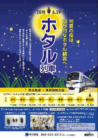 秩父鉄道株式会社 東武レジャー企画株式会社 初夏の夜は幻想的なホタル観賞へ 秩父鉄道×東武動物公園「ホタル列車」運行 車内でホタル観察&ホタル観賞スポットへご案内 秩父鉄道株式会社(本社:埼玉県熊谷市、代表取締役社長:大谷 隆男)と東武動物公園(運営:東武レジャー企画株式会社、本社:埼玉県南埼玉郡宮代町、取締役社長:日置 岳人)では、6月29日(土)に専用車内でホタルを間近で観察できる「ホタル列車」を運行します。本企画は今年で3回目となり、車内では東武動物公園の「ほたリウム」で飼育している「ヘイケボタル」を観察しながら、同園の飼育係からの説明を聞くことができるほか、御花畑駅下車後に秩父市内ホタル観賞スポットへご案内します。また、秩父鉄道では、「ホタル観賞ハイキング」も実施します。詳細は下記のとおりです。 1.秩父鉄道×東武動物公園「ホタル列車」 1) 運行日 2019年6月29日(土) 2) イベント開催区間 秩父鉄道 急行秩父路7号(くだり羽生駅-御花畑駅間) 3両のうち専用車両1両 <おもな停車駅時刻> 羽生駅発(17:30)→熊谷駅発(17:53)→寄居駅発(18:14)→長瀞駅発(18:29)→秩父駅(18:45)→御花畑駅着(18:46) 3) 参加費 無料 ※ご乗車には普通乗車券のほか急行券(大人200円 小児100円)が必要です 4) イベント実施内容 ・専用車内でホタル観察 ※明るい場所での昆虫観察です ・東武動物公園飼育係による説明 ・ご乗車の方に特別乗車記念証をプレゼント ・御花畑駅下車後、希望者を秩父市内ホタル観賞スポットへご案内(徒歩) (秩父市上町・御花畑駅下車徒歩約20分) ※現地到着後、解散 ※雨天の場合、ホタルの観賞はできません。あらかじめご了承ください。 ※観賞スポットに行かれる方は懐中電灯をご持参のうえ、歩きやすい服装でご参加ください。 ・特別ヘッドマーク掲出(6月15日(土)〜7月15日(月・祝)・6000系車両1編成) 2.秩父鉄道「ホタル観賞ハイキング」(一般向・約3km・約1時間) 1) 開催日 2019年6月1日(土)、2日(日)、8日(土)、9日(日) 2) 受付 秩父鉄道 御花畑駅 18:00〜19:00(当日受付) 3) 参加費 無料 4) 行程 御花畑駅→秩父札所13番(慈眼寺)→金刀比羅神社→市立図書館→上町街かどギャラリー→上町ホタル観賞スポット(ホタル観賞)→<復路は往路の逆>→御花畑駅 ※雨天の場合、ホタルの観賞はできません。あらかじめご了承ください。 ※懐中電灯をご持参のうえ、歩きやすい服装でご参加ください。 <秩父地域の主なホタル観賞スポット> 時期:6月上旬〜7月上旬 ※天候等により異なります 豊かな自然が残る秩父地域ではホタル観賞が楽しめます。 ○秩父市上町 交通:秩父鉄道 御花畑駅下車徒歩約20分 ○秩父ミューズパーク 交通:秩父鉄道 秩父駅下車タクシー利用 ○花ハス園 交通:秩父鉄道 武州日野駅下車徒歩約10分 <東武動物公園「ほたリウム」概要> ◇展示時間:11時00分〜16時00分(夏季時間変更あり) ◇場所 :東武動物公園内 ◇所要時間:約15分 ◇料金 :400円(税込) ◇定員 :18名(入替制) ◇施設内容:「ほたリウム」は通年でホタルが鑑賞できる劇場型の施設です。ヘイケボタルが約1万匹生息しており、ホタルが産卵する陸地と幼虫が生息する水場が再現された大型水槽(2m×2m×3m)で常時50匹から100匹のホタルを展示しています。 暗闇で約7分間、目を慣らしていただき、その後ホタルの光をゆっくり見ることができます。 |