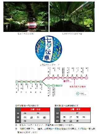 叡山電鉄株式会社 〜 みなさまの願いが伝わりますように 〜 でんしゃ 「七夕伝車」の運行、「青もみじのライトアップ」を実施します 8月3日(土)には星空観望会「悠久の夜空」を開催 叡山電鉄株式会社(本社:京都市左京区、社長:塩山等)では、2019年7月1日(月)〜8月15日(木)の間、七夕にちなんだイベントとして「七夕伝車(たなばたでんしゃ)※」を運行します。 七夕伝車は、お客さまに書いていただいた願い事を車内に飾って運行し、期間終了後は七夕にゆかりの深い貴船神社へ奉納します。 また、期間中の土曜・休日ダイヤ実施日には、「青もみじのライトアップ」を実施。鞍馬線市原駅〜二ノ瀬駅間の「もみじのトンネル」をライトアップし、この区間を通過する列車は車内の明かりを消してゆっくりと走ります。ライトに照らされた青もみじは涼しげな雰囲気を感じさせ、夏夜のひとときをお楽しみいただけます。 さらに、期間中の8月3日(土)には、現在、鞍馬駅などで開催中の「悠久の風〜南部風鈴によせて〜」との連動企画として、星空観望会「悠久の夜空」を初めて開催。星のソムリエ(星空案内人)の解説のもと、スター・ウィークでもあるこの期間中に、七夕伝説や宮沢賢治「銀河鉄道の夜」をイメージした星座の話を織り交ぜながら、天体望遠鏡で夏の夜空を観測します。 今年の夏は、ぜひ叡山電車で幻想的な夏夜のひとときをお楽しみください。 詳細は別紙をご覧ください。 ※みなさまの願いが伝わるようにと、七夕電車>ではなく七夕伝車と名づけています。 (別紙) 「七夕伝車(たなばたでんしゃ)」「青もみじのライトアップ」「悠久の夜空」概要 @七夕伝車(たなばたでんしゃ) 鞍馬線を走る800系車両(2両1編成)の車内にお客さまに書いていただいた願い事を飾って運行し、期間終了後は七夕にゆかりの深い貴船神社へ奉納します。 1.運行期間 2019年7月1日(月)〜8月15日(木) 2.願い事短冊募集期間 2019年8月12日(月・休)まで随時受付 3.料 金 無料 4.受付場所 出町柳駅「七夕伝車 願い事応募箱」 ※駅などに設置するパンフレットに記載の短冊を切り取ってご応募ください。 ※内容が不適切と思われるものは掲出いたしかねますのでご了承ください。 ※「七夕伝車」の運転時間は日によって異なります。また、車両点検やその他の理由により運休や運転区間の変更などがありますのでご了承ください。 A青もみじのライトアップ 鞍馬線市原駅〜二ノ瀬駅間の「もみじのトンネル」をライトアップし、通過する列車は車内の明かりを消してゆっくりと走ります。 1.実施期間 2019年7月1日(月)〜8月12日(月・休) の土曜・日曜・祝日・休日 と8月13日(火)、14日(水)、15日(木) 2.徐行区間 鞍馬線 市原駅〜二ノ瀬駅間にある「もみじのトンネル」区間 (約250m) 3.対象列車 【土曜・休日ダイヤ】 出町柳駅 18:00発〜20:03発の 鞍 馬 駅ゆき 鞍 馬 駅 18:37発〜20:39発の 出町柳駅ゆき ※8月13日(火)、14日(水)、15日(木)は「土曜・休日ダイヤ」で運行します。 *伊藤注:ダイヤは添付画像をご参照ください B星空観望会「悠久の夜空」 「悠久の風〜南部風鈴によせて〜」との連動企画として開催。星空案内人の解説のもと、スター・ウィークでもあるこの期間中に、七夕伝説や宮沢賢治「銀河鉄道の夜」をイメージした星座の話を織り交ぜながら、天体望遠鏡で夏の夜空を観測します。 1.日 時 2019年8月3日(土) 19:00〜21:00 ※雨天中止 2.場 所 鞍馬駅 駅前広場 3.参 加 料 無料 4.講 師 星のソムリエ(星空案内人) 5.参加方法 自由参加。上記時間内に開催場所へお集まりください。 6.主 催 叡山電鉄株式会社 7.協 力 ほしの学校☆大阪 (参考) 「悠久の風〜南部風鈴によせて〜」 叡山電車沿線の鞍馬と岩手県の2つの場所が、源義経ゆかりの地であることから、2013年から毎年6月1日〜9月30日に開催しているもので、岩手県名産の南部風鈴を鞍馬駅に飾り付け、透明感のある音色で京都の避暑地・鞍馬へ訪れた方へ涼しさと癒しをお届けしています。 期間中には、うちわ型の1日乗車券「悠久の風きっぷ」の発売、南部風鈴を車内に取り付けた風鈴電車「悠久の風号」の運行を行っています。 以 上 |