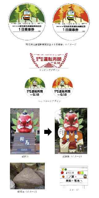 叡山電鉄株式会社 2021年09月10日 〜 2021年9月18日(土)運転再開! 〜 「鞍馬線全線運転再開記念企画」を実施します ・「鞍馬線全線運転再開記念1日乗車券」の発売 ・車両への装飾、ヘッドマークの掲出 ・SDGs(BIOSTYLE)の取り組み ・「運転再開記念式典」を実施 叡山電鉄株式会社(本社:京都市左京区、社長:豊田秀明)では、昨年7月8日に発生した鞍馬線貴船口駅付近の土砂崩れの影響により運休していた市原駅〜鞍馬駅間の運転再開を記念し、9月18日(土)より「〜自然、つながる 街・旅・心〜」をキャッチフレーズに「鞍馬線全線運転再開記念企画」を実施します。 運転再開当日は「鞍馬線全線運転再開記念1日乗車券」の発売、展望列車「きらら」への「運転再開記念ラッピング」装飾及び800系車両、700系車両への「運転再開記念ヘッドマーク」掲出などを開始するほか、鞍馬駅前広場において「運転再開記念式典」を実施します。 詳細は別紙をご覧ください。 新型コロナウイルスの感染状況により、内容を変更する場合がございます。その際は、随時、叡山電車公式ホームページおよび叡山電車公式Twitterにてご案内いたします。 (別紙) @「鞍馬線全線運転再開記念1日乗車券」の発売 発売期間 2021年9月18日(土)〜12月31日(金) 有効期間 発売期間中のお好きな1日 発売価格 大人 1,200円(大人のみ) 有効区間 叡山電車全線 発 売 数 「青もみじデザイン」「紅葉デザイン」各500枚限定 発売場所 出町柳駅 発売時間 初発〜終発 ※2021年9月18日(土)のみ6:00〜終発 ※その他、出町柳駅以外で発売する場合がございます。 ※状況によりお1人さまあたりの発売数を制限する場合があります。また、発売数に限りがございますので、なくなり次第終了します。 A「運転再開記念ラッピング」の実施 900系展望列車「きらら」の2編成に運転再開を記念した装飾を実施して運行します。 運行期間 2021年9月18日(土)〜10月31日(日) 車両番号 901−902号車、903−904号車 B「運転再開記念ヘッドマーク」の掲出 「もみじのトンネル」を走る展望列車「きらら」をデザインしたヘッドマークを掲出して運行します。 運行期間 2021年9月18日(土)〜10月31日(日) 掲出車両 800系車両2編成、700系車両1編成 ※一時的にヘッドマークの掲出を中止する場合があります。 ※運転時間は日によって異なります。また、車両点検やその他の理由により運休や運行期間終了日を変更することがありますのであらかじめご了承願います。 そ の 他 岩手県の三陸鉄道でも同様のイメージのヘッドマークを掲出していただきます。 運行期間 2021年9月18日(土)〜12月31日(金) C「運転再開記念着せ替え天狗」の実施 鞍馬駅前のモニュメント「大天狗(おおてんぐ)」に衣装型の装飾を施し、コメントパネルを設置します。 衣装は、「大天狗」デザインと同じく、京都精華大学の学生がデザインしたものです。 設 置 日 2021年9月18日(土) D「鞍馬石を活用したフォトスポット」の設置 鞍馬地区名産の「鞍馬石」を加工して、鞍馬駅前に新たなフォトスポットを設置します。 設 置 日 2021年9月18日(土) ESDGs(BIOSTYLE)の取り組み 2018年の台風21号や昨年7月の豪雨により、沿線で多数発生した倒木を活用して看板やグッズを作成します。 (1)お客さまをお迎えする看板を二ノ瀬駅に設置 山の空気が美味しく川のせせらぎが心地よい「二ノ瀬・貴船・鞍馬」。 災害を乗り越え、自然豊かで多くの生き物が暮らすこの地区への誘いの想いを看板に込めました。 設 置 日 2021年9月18日(土) (2)風倒木(間伐材)を利用した木皿の配布 今回の災害を忘れないように、そして風倒木(間伐材)を無駄にしないよう、「運転再開記念ヘッドマーク」の刻印入りヒノキ木皿を、京都精華大学のご協力のもと制作しました。 9月18日(土)13時より鞍馬駅前にて、運転再開に関するアンケートにお答えいただいた方、先着100名様にプレゼントいたします。 F「運転再開記念式典」の実施 運転再開当日に地元関係者をはじめとするお世話になった皆さまをご招待し、記念式典、記念列車の出発式を行います。 開催日時 2021年9月18日(土)10時30分〜11時30分(予定) 開催場所 鞍馬駅駅前広場 出 席 者 国土交通省近畿運輸局代表、京都府代表、京都市代表、地元関係者、京阪ホールディングス関係者ほか 内 容 主催者挨拶、来賓ご挨拶、記念列車運転士への花束贈呈、記念撮影ほか ※列車の運行は初発(修学院駅5時18分発鞍馬駅ゆき、鞍馬駅5時53分発出町柳駅ゆき)から再開します。 ※新型コロナウイルス感染症の感染状況により、内容を変更する場合があります。 G「復旧までのあゆみ展」「鞍馬PRアニメ上映」の開催 災害発生直後から運転再開までの記録の紹介や、左京区の「鞍馬の文化」発信プロジェクトの一環として京都精華大学の学生が制作したショートアニメーション(約2分)「京の神秘 鞍馬山」の上映を行います。 開催場所 貴船口駅待合室「令月」 開催期間 2021年9月18日(土)〜10月31日(日) 開催時間 平日10時30分〜15時00分/土曜・休日10時30分〜16時00分 H「運転再開イベ