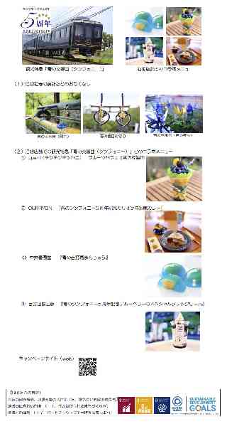 NEWS RELEASE 2021年 9月21日 〜観光特急「青の交響曲(シンフォニー)」運行開始5周年記念 第2弾〜 吉野線観光キャンペーンを実施します 近鉄では、「上質な大人旅」をコンセプトに大阪阿部野橋〜吉野間で運行している観光特急「青の交響曲(シンフォニー)」が2021年9月10日(金)に運行開始から5周年を迎えたのを機に、記念グッズの発売等に続く第2弾として、10月1日(金)から11月30日(火)までの間、吉野線沿線の社寺や店舗と共同で、飛鳥・吉野エリアの魅力を発信するキャンペーンを行います。 この機会に歴史や風景、食べ物など魅力あふれる吉野山や、古代ロマンあふれる飛鳥へ、観光特急「青の交響曲(シンフォニー)」に乗ってお出かけいただければと考えています。 【キャンペーン内容】 1.沿線社寺の装飾などのおもてなし ・岡寺 青の手水舎 ・吉野神宮 青の猪目お守り、青の手水舎 2.沿線店舗でのコラボメニュー発売 ・...pani (テンテンテンパニ) フルーツパフェ『青の交響曲』 ・CURRYON 『青のシンフォニー5周年記念カリオン特製鹿カレー』 ・中井春風堂 『青の吉野葛まんじゅう』 ・吉野山桜近藤 『青のシンフォニー5周年記念ブルーベリーのスペシャルソフトクリーム』 3.吉野ウェルカムキャンペーン 観光特急「青の交響曲(シンフォニー)」の特急券や記念乗車証のご呈示で対象店舗の特典が受けられます 4.観光特急「青の交響曲(シンフォニー)」運行開始5周年記念ツアー ・湯盛温泉「ホテル杉の湯」の“ロイヤルランチ”と日本遺産の「丹生川上神社上社」特別参拝 ・観光特急「青の交響曲(シンフォニー)」に乗って車庫めぐりと洗車体験&撮影会 【キャンペーンの概要】 1.実施期間 2021年10月1日(金)〜11月30日(火) 2.実施内容 (1)沿線社寺の装飾などのおもてなし 沿線の社寺で観光特急「青の交響曲(シンフォニー)」をモチーフにした手水舎の装飾やお守りで、お客さまをおもてなしします。 @岡寺 青の手水舎 「青の交響曲(シンフォニー)」の車体カラーに合わせ、青のビー玉で手水舎を彩りました。 アクセス 橿原神宮前駅→バス「岡寺前」下車徒歩約10分 公式Instagram https://www.instagram.com/okadera3307/ A吉野神宮 青の猪目お守り 「青の交響曲(シンフォニー)」の車体カラーである青色と金色の水引を使った、このキャンペーン限定の猪目お守りです。 青の手水舎 「青の交響曲(シンフォニー)」の車体カラーである青色・金色や水色の折り鶴で彩りました。 アクセス 吉野神宮駅→徒歩約20分 公式Instagram https://www.instagram.com/yoshino_jingu/ ※各社寺の装飾は、時期によって予告なく変更することがあります。 (2)沿線店舗での観光特急「青の交響曲(シンフォニー)」とのコラボメニュー 沿線の店舗で観光特急「青の交響曲(シンフォニー)」をモチーフにした限定コラボメニューで、お客さまをおもてなしします。 @...pani(テンテンテンパニ) フルーツパフェ『青の交響曲』 価 格 1,000円(税込) 商品内容 「青の交響曲(シンフォニー)」の列車をイメージした特製フルーツパフェ。車体カラーの「青」色をブルーベリーで、ラインの「金」色を奈良の旬の柿で、車輪の形や座席の「緑」色をキウイでイメージしました。 ※イメージ色の3つのフルーツは必ず使用いたしますが、他のフルーツ等は仕入れ状況により異なります。 ※数量限定販売のため売切れ次第終了 アクセス 飛鳥駅下車すぐ 公式Instagram https://www.instagram.com/pani_asuka/ ACURRYON 『青のシンフォニー5周年記念カリオン特製鹿カレー』 価 格 2,000円(税込) 商品内容 じっくり煮込んだ野菜や果物、柔らかく臭みのない鹿肉をワインと数種類のスパイスで掛け合わせた「鹿カレー」。「青の交響曲(シンフォニー)」の車体カラーである青×金をイメージしています。三種の小皿・サラダ・デザート付き。 アクセス 橿原神宮前駅または飛鳥駅→バス「万葉文化館西口」下車すぐ (万葉文化館内) 公式Instagram https://www.instagram.com/curryon_asuka/ B中井春風堂 『青の吉野葛まんじゅう』 価 格 1個160円(税込) 商品内容 秋の味覚「安納芋」の餡を、青く染めた葛生地で包み、表面に金箔を飾ったちょっと贅沢な葛まんじゅう。見た目と味のギャップが楽しい。夏のような爽やかな青色ですが、口の中には秋の香りが広がります。 ※仕入れの都合により早期終了する場合があります。 アクセス 吉野駅→ロープウェイ吉野山駅下車→徒歩約10分 公式HP http://nakasyun.com/ C)吉野山桜近藤 『青のシンフォニー5周年記念ブルーベリーのスペシャルソフトクリーム』 価 格 380円(税込) 商品内容 昔ながらのバニラソフトに自家製ブルーベリーソースをたっぷりかけたスペシャルソフトクリーム。ブルーベリーは吉野山産。カップは、「青の交響曲(シンフォ二ー)」5周年と吉野山桜近藤のコラボロゴ入り。 アクセス 吉野駅下車すぐ 公式HP https://yoshino-kondo.jp/ (3)吉野ウェルカムキャンペーンの実施 5周年記念キャンペーンの期間中、観光特急「青の交響曲(シンフォニー)」を利用して吉野山へお越しいただいたお客さまを対象に、「吉野ウェル