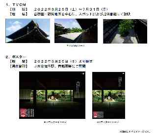 「そうだ京都、行こう。」夏編宣伝展開 京都を代表する名庭・建仁寺の潮音庭を、普段とは違った視点でご紹介。潮音庭を小書院から影越しに眺めるなど、悠久の歴史が育んだ京都ならではの「影」に注目して制作した映像、画像をTVCM、交通広告、WEB、SNS等で展開します。 1.TVCM 【期 間】2022年6月25日(土)〜7月31日(日) 【地 域】首都圏・静岡地区を中心に、スポットおよび提供番組にて放映 2.ポスター 【期 間】2022年6月25日(土)より順次 【掲出箇所】JR東海各駅、首都圏等にて展開 ※TVCMやポスターなどの広告宣伝物はこちらからご覧ください。 https://souda-kyoto.jp/other/ryosagashi/ |
