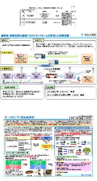 国土交通省 Press Release Ministry of Land,Infrastructure,Transport and Tourism 令和4年11月11日 総合政策局物流政策課 アンテナショップへの高速バス貨客混載の取組などを支援 〜令和4年度「モーダルシフト等推進事業費補助金」の交付決定(二次)〜 令和4年度「モーダルシフト等推進事業費補助金」の二次公募の応募案件について、計画策定経費補助2件の交付決定を行いました。 国土交通省では、物流分野における労働力不足への対応や環境負荷の低減を図るため、物流総合効率化法に基づき、トラック輸送から鉄道・海運への転換(モーダルシフト)や幹線輸送網の集約化等の取組を進めております。 同法に基づく総合効率化計画の策定やモーダルシフト等の取組を支援する補助事業の募集を行い、別紙の2件について、事業者の認定及び交付決定を行いました。 今後も「総合物流施策大綱(2021年度〜2025年度)」を踏まえつつ、労働生産性の改善やカーボンニュートラルの推進等に向けた革新的な取組を進めてまいります。 【採択案件】 ○計画策定経費補助 ・愛知県新城市→愛知県名古屋市へトラック輸送しているアンテナショップへの農産品・特産品等の高速バスのトランクルームを活用した貨客混載 ・関西(高砂市)〜関東(神栖市)間で陸送している貨物について、40ft海上コンテナのラウンドユースを伴う往復船舶モーダルシフト 【概要】 採択件数の内訳 ○計画策定経費補助 (今後、物流総合効率化法に基づく計画認定を目指す案件への補助):2件 >モーダルシフト:1件(船舶への転換) >そ の 他:1件(高速バスによる貨客混載) 【交付決定額】約360万円(2件合計) モーダルシフト等推進事業についての概要ページもあわせてご参照ください。 (https://www.mlit.go.jp/seisakutokatsu/freight/ms_subsidy.html) |