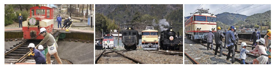 キャプション: DBきかんしゃ手回し体験(左)、きかんしゃ大集合(中)、EL綱引き大会(右)