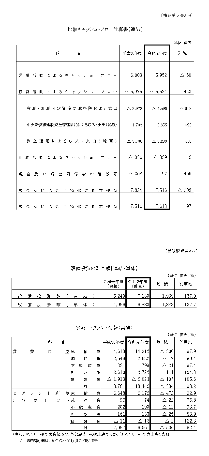 キャプション: 比較キャッシュフロー計算書【連結】 設備投資の計画額【連結・単体】 参考:セグメント情報(実績)
