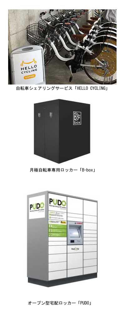 キャプション: 自転車シェアリングサービス、月極自転車専用ロッカー、オープン型宅配ロッカー