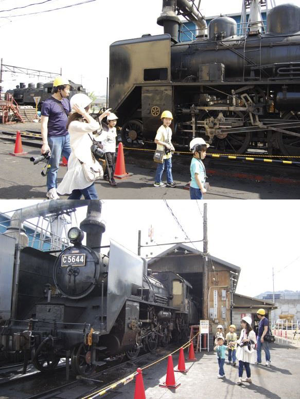 キャプション: 新金谷車両整備工場内の様子