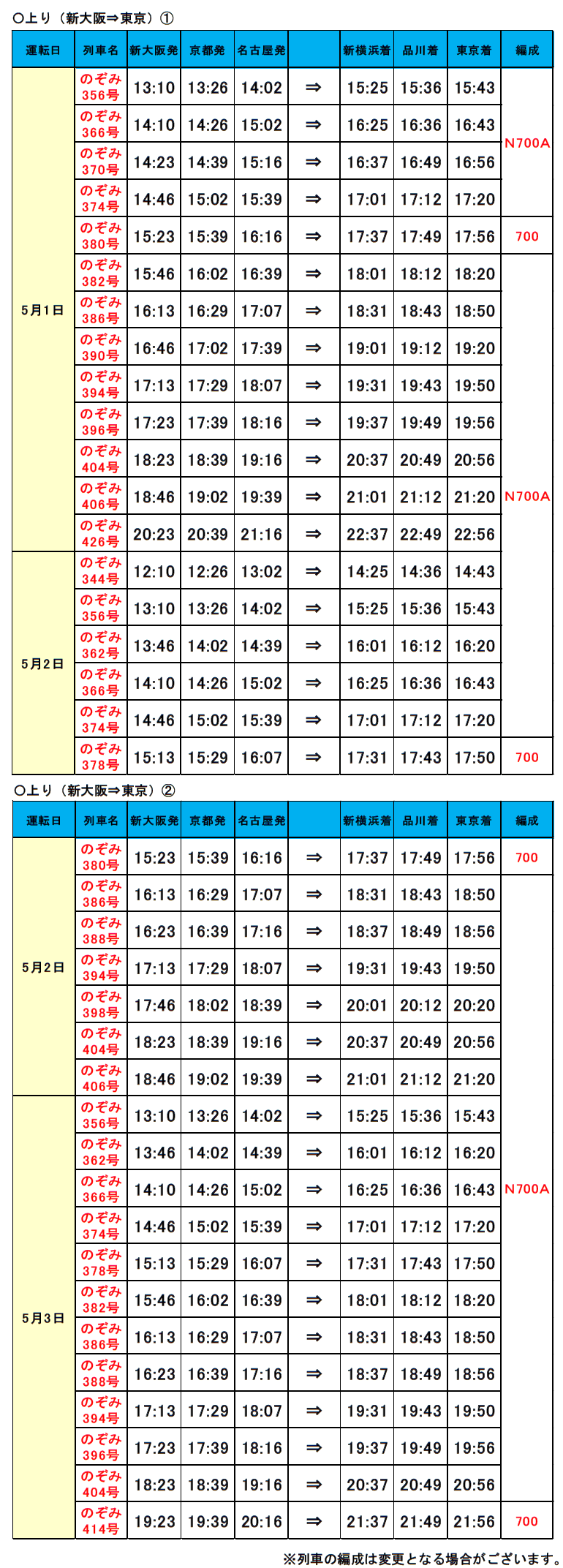 キャプション: 別紙 追加運転する列車一覧 上り(新大阪⇒東京)