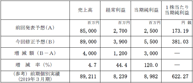 キャプション: 2020年3月期通期の個別業績予想値の修正