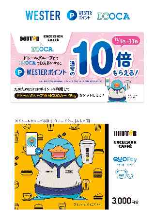 JR西日本グループ Release もっとつながる。未来が動き出す 2025年10月24日 西日本旅客鉄道株式会社 ドトールグループでWESTERポイントを導入 11月はポイント10倍キャンペーンを実施 西日本旅客鉄道株式会社(本社:大阪府大阪市、代表取締役社長:倉坂昇治)と株式会社ドトールコーヒー(本社:東京都渋谷区、代表取締役社長:星野正則)はこの度、ドトールグループの対象店舗(西日本エリア)でのお支払いにICOCAをご利用いただくと、WESTERポイントがたまるサービスを開始することに合意しました。 これを記念して、11月1日(土)から11月30日(日)の1か月間は、お買い上げ200円(税込)につき通常1ポイントのところ、WESTERポイント10倍付与特典がもらえるキャンペーンを実施します。 NEWS 01 これからは、ドトールグループの対象店舗(西日本エリア)でのお支払いにICOCAをご利用いただくと、ポイントがたまります。 ドトールグループの対象店舗(西日本エリア)で、お支払いにICOCAをご利用いただくことで、お買い上げ200円(税込)につきWESTERポイント1ポイントがたまります(ご利用翌月上旬の付与)。たまったWESTERポイントは1ポイントにつき1円として、ICOCAにチャージしてお買い物等にご利用いただけます。 開始日(予定):2025年11月1日(土) なお、ご利用いただくICOCAの種類や条件により、たまるポイントが異なります。詳細は下記ページをご確認ください。 <https://www.jr-odekake.net/icoca/guide/point/> NEWS 02 11月1日から11月30日の1か月間は、ドトールグループの対象店舗(西日本エリア)にてでお支払いするとWESTERポイントが通常の10倍たまるキャンペーンを開催! 開催期間 2025年11月1日(土)〜11月30日(日) 対象店舗 ドトールグループの対象店舗(西日本エリア) 特 典 WESTERポイント10倍付与 【特典内容】 対象店舗にてICOCAでお支払いするとWESTERポイントが通常の10倍付与されます。通常は200円(税込)でWESTERポイント1ポイント付与のところ、対象期間は10ポイント付与となります。 【ポイント付与時期】 ポイント付与は12月上旬を予定しています。 【対象者】 全ICOCAユーザー(カード型、モバイル型を含む全てのICOCA) 備 考 ・詳しい対象店舗、特典の諸条件や注意事項については後述キャンペーンページをご確認ください。 2.その他 ・本キャンペーンの詳細は下記のホームページをご覧ください。 < https://wester.jr-odekake.net/campaign/detail/012026102401 > NEWS 03 ためたWESTERポイント(基本)を利用してドトールグループ専用カードをゲットしよう! 11月1日(土)よりためたWESTERポイント(基本)を利用してドトールグループ専用 QUOカードPayをゲットすることが出来ます。ドトールグループ専用QUOカードPayはWESTERポイント利用商品ページよりお申込みいただけます。詳しくは下記ポイント利用商品ページをご確認下さい。 < https://dwmall.westjr.co.jp/shop/g/g2020090/ > ※記載の内容はすべて現時点での情報であり、変更となる可能性があります。 |