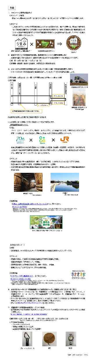 東海旅客鉄道株式会社 武豊線開業140周年キャンペーンについて 当社路線最古となる武豊線は1886年3月1日に開業し、2026年3月1日で140周年を迎えます。 これまで支えていただいたみなさまへの感謝の気持ちを込め、沿線の関係者のみなさまと共に、武豊線の魅力を存分にお楽しみいただける企画を展開します。 1. キャンペーン期間と記念ロゴ ・期間…3月1日(日)〜3月31日(火) ・ロゴ…「愛知『発酵食文化』振興協議会(※1)」のロゴと武豊線の乗務を担当する当社社員がデザインしたロゴを組み合わせてデザインしました。 2.記念ロゴのバッジを武豊線の乗務員、駅係員がキャンペーン期間中着用します ・記念ロゴをバッジにし、武豊線の乗務員、大府駅、半田駅の駅係員が着用します。 3.2015年2月末まで武豊線を走行したキハ75形(4両)で記念列車を運行します! ・運行日時…3月20日(金・祝)名古屋駅9時23分発〜14時31分着 ・運行経路…名古屋駅⇒武豊駅⇒(旧武豊線経由)⇒熱田駅⇒名古屋駅 ※お客様が乗車した列車が旧武豊線を走行するのは初めてです。 ※熱田駅下り3番線で武豊線沿線自治体や社員等のおもてなしを実施します。 ・この記念列車にご乗車いただける特別ツアーを2本実施します。 【武豊線探究学習ツアー】 参加対象:小学生とその保護者(18歳以上)の2名以上 −キハ75形での記念列車乗車に加え、沿線の歴史・文化等をご家族で一緒に探究学習いただけるイベントをご用意しています。 −発売方法…『「好き」を深める学び旅 学研×クラブツーリズム』(※2)をご覧ください。https://x.gd/5UXYw 【武豊線満喫ツアー】 参加対象:全員(※3) −キハ75形の復刻運転、旧武豊線走行のほか武豊駅構内入換運転等を満喫いただくツアーです。 −発売方法…「クラブツーリズム鉄道部公式X(※4)」をご覧ください。https://x.com/ct_tetsudou 4.さわやかウォーキング「武豊線開業140周年記念コース」を開催します【3月1日(日)】 ・大府駅と武豊駅それぞれをスタート・ゴールとするコースを開催します。 5.武豊線ゆかりの鉄道用品等のオークション販売 ・販売場所…JR東海MARKET オークションページ https://market.jr-central.co.jp/shop/e/eparts/ ・開催期間…3月20日(金)17時00分〜3月26日(木)23時59分 (※5) 各企画の詳細は別紙をご覧ください。 ※1 愛知の「発酵食文化」の振興及び国内外からの誘客につながる取り組みを実施している協議会であり、当社も参画しています。 ※2 準備出来次第クラブツーリズムのホームページで旅行商品の詳細をご覧いただけます。ツアーに関してはクラブツーリズムへお問い合わせください。 ※3 15歳未満は保護者の同行必須、18歳未満は保護者の同意書が必要になります。 ※4 「クラブツーリズム鉄道部公式X」での投稿後、クラブツーリズムのホームページ等で旅行商品の詳細をご覧いただけます。ツアーに関してはクラブツーリズムへお問い合わせください。 ※5 オークション販売の詳細、出品内容、その他注意事項はオークション開始後のご案内を参照ください。また、現在は名松線にゆかりのある鉄道用品等を出品しています。 ※6 輸送障害などにより予告なく運休や出発時刻・停車時間・編成の変更が発生する場合があるほか、イベントが中止となることがあります。払戻しについてはクラブツーリズムへお問い合わせください。 詳細は別紙をご参照ください。イラストはすべてイメージです。 |