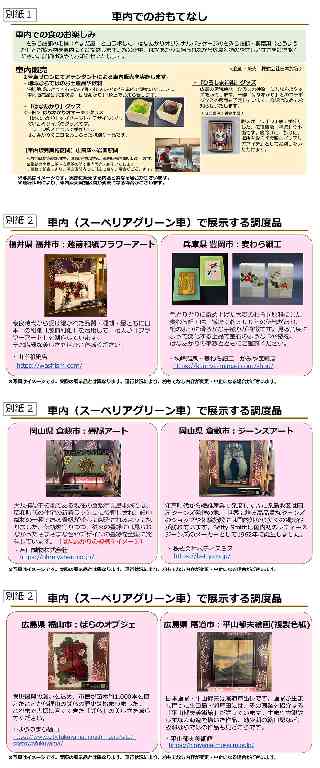 JR西日本グループ Release もっとつながる。未来が動き出す 2026年 1月28日 西日本旅客鉄道株式会社 観光列車「はなあかり」から始まる 広島・宮島・岩国心ときめく春の特別旅 広島城や平和記念公園など歴史と文化が息づく広島、世界遺産・厳島神社を擁する宮島、そして錦帯橋の美しい景観を誇る岩国。この春は、観光列車「はなあかり」が瀬戸内の名立たる観光地を繋ぎ、特別な旅をお届けします。優雅で華やかな車内で地域文化や味覚を味わい、心弾む春のひとときをお楽しみいただけます。目的地での体験へのときめきが広がる贅沢な乗車時間をどうぞご期待ください。 1.運転計画 (1)運転期間 2026年 3月20日(金)、21日(土)、22日(日)、28日(土)、29日(日) および 2026年4〜6月の土日の一部日程【各日往復運行】 ※ 2026年4月以降の運転日は、改めてお知らせいたします。 (2)運転区間 広島〜宮島口〜岩国(山陽線経由) (3)運転時刻・停車駅 午前に広島駅〜宮島口駅〜岩国駅、午後に岩国駅〜宮島口駅〜広島駅を1日1往復します。 ※ 詳細な時刻は、2月上旬以降「はなあかり」特設サイトにてお知らせします。 2.発売箇所 tabiwaトラベル「鉄道ファンの宝箱」(https://www.nta.co.jp/jrodekakenet/train/)にて旅行商品を販売します。2026年3月の運転分は、【スーペリアグリーン】は 2026年 2月18日(水)13:00から、【グリーン席】はご乗車日の30日前の10:00から発売開始します。 なお、海外からお越しのお客様にもご利用いただけるよう、主な海外 OTA・旅行会社を通じて、個人のお客様向け商品や団体ツアー商品を販売する予定です。 ※旅行商品の詳細や販売価格等は、各販売サイトにてご確認ください。 3.旅行商品内容・車内のおもてなし 別紙 1 ・ご乗車のお客様には、宮島の老舗「やまだ屋」のもみじ饅頭・桐葉菓(とうようか)とお飲み物を「はなあかり」オリジナルパッケージにて車内にてご提供します。 ・「はなあかり」の車内にはアテンダントが乗車し、地域ならではのお土産品や飲料、「はなあかり」グッズ、「ひろしま神楽」グッズ等を販売します。 ※詳細は改めてお知らせいたします。 4.車内の調度品 別紙2 スーペリアグリーン車飾り棚では、これまで観光列車「はなあかり」が運行してきた沿線各地の調度品を取り揃え展示します。座席ごとに異なる工芸品・アート作品を展示しますので、繰り返しご乗車いただくごとに新たな出会い・発見をお楽しみいただけます。 5.その他 旅行会社専用での取扱いとなります。全国の駅のみどりの窓口、券売機、JR西日本インターネット予約「e5489」等での発売はございません。 2026年4月以降運転分の tabiwaトラベルでの発売開始日については、改めてお知らせいたします。 観光列車「はなあかり」に関する詳細は、「はなあかり」特設サイトでご案内いたします。 https://www.jr-odekake.net/railroad/hanaakari/ |