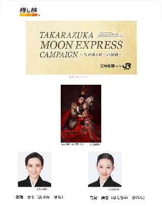 東海旅客鉄道株式会社 JR東海「推し旅」と 宝塚歌劇月組公演『RYOFU』『水晶宮殿(クリスタルパレス)』の タイアップキャンペーン実施について このたび、JR東海「推し旅」では、宝塚歌劇月組公演『RYOFU』『水晶宮殿(クリスタルパレス)』とのタイアップキャンペーンを実施します!キャンペーンのナビゲーター(案内役)を宝塚歌劇団月組の彩海せら(あやみせら)さん、花妃舞音(はなひめまのん)さんが務めるほか、東海道新幹線車内限定で楽しめる限定コンテンツの配信や公演チケットが抽選で当たるプレゼント企画、新幹線1編成を貸し切ったイベントなど、様々な企画をご用意しております。詳細やビジュアルは1月28日(水)に公開予定!この機会にぜひ東海道新幹線に乗って宝塚大劇場、東京宝塚劇場へおでかけください! ■キャンペーンタイトル 宝塚歌劇 with JR東海 TAKARAZUKA MOON EXPRESS CAMPAIGN 〜月が導く夢への旅路〜 ■実施期間 2026年1月28日(水)〜7月19日(日) ■実施概要 @東海道新幹線車内限定コンテンツの実施 東海道新幹線の車内から、キャンペーンサイトにアクセスするとお楽しみいただけます。 月組タイアップ配信 <実施期間>2026年1月28日(水)〜7月19日(日) ・実施期間中、通期で本キャンペーンナビゲーターによる限定トークをお楽しみいただけます。 ・期間限定で月組トップスター鳳月 杏(ほうづき あん)さんをはじめ、スターたちが登場する映像コンテンツをお楽しみいただけます。 ※映像コンテンツの配信期間は決まり次第キャンペーンサイトにてお知らせします。 抽選で当たるプレゼント企画に参加可能!スペシャルコンテンツ <第1弾:2026年1月28日(水)〜4月14日(火)> ・オリジナルスマホ壁紙(全3種)をランダムで1種プレゼント ※オリジナルスマホ壁紙のプレゼントは3月上旬頃で終了します。 ・月組スターボイス付きARフォト(全6種)をランダムで1種お楽しみいただけます。 ※ARフォトは3月中旬頃からお楽しみいただけます。 ・壁紙プレゼントもしくは月組スターボイス付きARフォト企画に参加された方は、月組公演『RYOFU』『水晶宮殿(クリスタルパレス)』の宝塚大劇場公演チケットが抽選で当たるプレゼント企画に応募可能! ※いずれもお一人様1日につき1回まで、各コンテンツの実施期間中何度でも参加・応募可能。 <第2弾:2026年4月15日(水)〜6月1日(月)> ・月組スターによる限定コンテンツをお楽しみいただけます。 ・さらに限定コンテンツをお楽しみいただいた方は、月組公演『RYOFU』『水晶宮殿(クリスタルパレス)』東京宝塚劇場公演チケットが抽選で当たる、プレゼント企画に応募可能!※お一人様1日につき1回まで、期間中何度でも応募可能。 <第3弾:2026年6月2日(火)〜7月19日(日)> ・月組スターによる限定コンテンツをお楽しみいただけます。 ・さらに限定コンテンツをお楽しみいただいた方は、月組公演『 RYOFU』『水晶宮殿(クリスタルパレス)』出演者のサイン色紙が抽選で当たる、プレゼント企画に応募可能!※お一人様1日につき1回まで、期間中何度でも応募可能。 A東海道新幹線乗車特典のオリジナルグッズがもらえる! <実施期間、場所> 宝塚大劇場 :2026年4月4日(土)〜5月17日(日) 東京宝塚劇場:2026年6月6日(土)〜7月19日(日) ・東海道新幹線車内限定コンテンツに参加の上、月組公演『RYOFU』『水晶宮殿(クリスタルパレス)』を各劇場でご観劇いただいた方に、オリジナルグッズをプレゼント。実施期間、場所については、各公演スケジュールに準じます。 ※お一人様1日につき1回まで、各公演先着100名様限定(なくなり次第配布終了) B東海道新幹線で観劇に行こう! 東海道新幹線1編成を貸し切った TAKARAZUKA MOON EXPRESSを運行! ・本キャンペーンの実施を記念して、1編成貸切新幹線ツアーを販売。新幹線車内を TAKARAZUKA MOON EXPRESS仕様に装飾するなど、様々な企画を実施予定。観劇までの道中も宝塚歌劇の世界を楽しもう! <運行日> ・2026年5月16日 (土) 東京→新大阪 ※同日15:30開演の宝塚大劇場公演チケット付き ・2026年6月20日 (土) 新大阪→東京 ※同日15:30開演の東京宝塚劇場公演チケット付き Cその他連動企画 ・本キャンペーンの実施を記念して、月組公演『RYOFU』『水晶宮殿(クリスタルパレス)』の公演チケット(宝塚大劇場公演:SS席、S+席、東京宝塚劇場公演:SS席、S席)が付いた観劇プランをJR東海ツアーズで販売予定。 ・東海道新幹線主要駅でのデジタルサイネージ放映や新大阪駅での特設ポスター掲出なども実施予定(一部、キャンペーン開始前からの実施となります)。 詳細は順次キャンペーンサイトにて公開いたします。お楽しみに! ※詳細は、JR東海キャンペーンサイト「推し旅」(https://recommend.jr-central.co.jp/oshi-tabi/)、および Xアカウント「推し旅【JR東海公式】」(@oshitabi_update)にてお知らせいたします。 ※宝塚歌劇月組公演『RYOFU』『水晶宮殿(クリスタルパレス)』の詳細については、宝塚歌劇公式HP(https://kageki.hankyu.co.jp/revue/2026/ryofu/)をご覧ください。 ※画像は全てイメージです。 ※キャンペーンの内容は予告なく変更・中止に