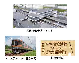 東海旅客鉄道株式会社 特別急行「きくがわ」号の運転について JR東海では菊川駅橋上駅舎・南北自由通路完成をお祝いして、菊川市と連携した特別な列車を運行します。静岡から菊川までノンストップで行くこの日限りの特別な列車で、ぜひ菊川市へお出かけください! ○特別急行「きくがわ」号の運行 ・運転日 2026年3月28日(土) ・運転区間・時刻 静岡11:11発 → 菊川11:38着 ※ 途中駅には停車いたしません。 ・使用車両 313系8000番台6両編成・全車普通車指定席 ※ 窓側席のみの販売となります。 ※ ボックス席の一部は座席の向きが進行方向と逆向きになります。 ※ 使用車両は予告なく急遽変更する場合があります。 ・発売開始 2026年2月28日(土)10時 ・発売箇所 全国のJRの主な駅・旅行会社の窓口のほか、「えきねっと」「e5489」「指定席券売機」でも発売します。 ・料金 普通乗車券のほか、指定席特急券(1,490円)が必要です。 ※ 定期券を使用して乗車することはできません。定期券をお持ちの場合であっても、普通乗車券をお買い求めください。 ○特別急行「きくがわ」号へ乗車された方への特典 ・車内では静岡県産の木材(ヒノキ)を使用したオリジナル記念乗車証を配付します。 ・菊川駅到着後、新駅舎の一部を先行してご覧いただけます。 ○定期列車の時刻変更 特別急行「きくがわ」号の運行に伴い、東海道本線下り普通列車(興津駅 10:42 始発、島田駅 11:32 終着)の時刻が以下のとおり変更になります。 ┌──┬────┬────┬─────┬────┬────┬────┐ │駅名│用宗(発)│焼津(発)│西焼津(発)│藤枝(発)│六合(発)│島田(着)│ ├──┼────┼────┼─────┼────┼────┼────┤ │所定│ 11:11 │ 11:17 │ 11:21 │ 11:24 │ 11:28 │ 11:32 │ │変更│ 11:17 │ 11:23 │ 11:26 │ 11:29 │ 11:33 │ 11:36 │ └──┴────┴────┴─────┴────┴────┴────┘ ※当列車の興津駅〜安倍川駅の出発時刻、到着時刻は変更ありません。 ※ 橋上駅舎の供用開始日は2026年3月29日(日)始発からとなります。 ※ 輸送障害等により予告なく企画内容が変更・中止となる場合があります。 ※ 写真・イラストはイメージです。 |