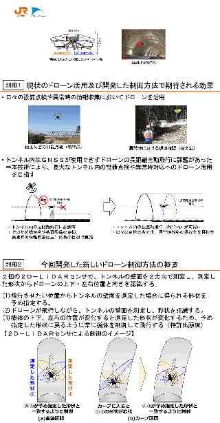 東海旅客鉄道株式会社 エアロセンス株式会社 トンネル内で長距離自動飛行が可能なドローンの制御方法の開発 東海旅客鉄道株式会社(以下「JR東海」)とエアロセンス株式会社は、トンネル内で長距離自動飛行が可能なドローンの制御方法を開発しました。この制御方法は、10kmを超える長大なトンネルでの設備点検や異常時対応への活用が期待できます。 1.背景(別紙1) ・JR東海では、将来の労働力人口減少に対応するためにICT等の最新技術を活用し、効率的な業務遂行体制の構築に取り組んでいます。日々の設備点検や異常時の情報収集は、これまでは主に係員の目視で行ってきましたが、ドローンで取得したデータなどを活用した省力化にも取り組んでいます。 ・一般的にドローンは、全地球航法衛星システム(GNSS)を活用して機体の位置を認識しながら飛行させることができますが、トンネル内ではGNSSが使用できないため、センサ等を活用して自らの上下・左右位置と向きを認識し、周囲の構造物と一定の距離をとりながら飛行させる必要があります。 ・トンネル内での制御方法の一つに、3D−LiDARセンサ注1を活用する方法がありますが、三次元空間での複雑な情報処理を伴うため、その多くは時速約10km以下の低速飛行となります。その結果、長距離の自動飛行が難しく、長大なトンネルの設備点検には向かないという課題がありました。 ・そこで、GNSSが使用できない環境下でも長距離の自動飛行を可能とする新しい制御方法を開発しました。 2.新しい制御方法と長距離飛行試験の結果(別紙2) ・ドローンに搭載した2個の2D−LiDARセンサ注2で、予め指定した飛行位置と実際の飛行位置とのずれを把握し、自動で補正しながら飛行します。(特許出願済) ・今回、この制御方法を搭載したプロトタイプ機で、山梨リニア実験線のトンネル内で飛行試験を行い、時速約30kmで10km程度の距離を安定して自動飛行できることを確認しました。 3.今後の予定 ・今後は、新幹線のように架線等の様々な設備・構造物があるトンネル内においても、安定した自動飛行ができるか検証を続けてまいります。本技術の実用化により、長大なトンネルでの点検等の省力化を目指します。 注1 空間内での物の位置を3次元的に測定できるレーザー光を用いたセンサ 注2 空間内での物の位置を一つの平面上のみで測定できるレーザー光を用いたセンサ |