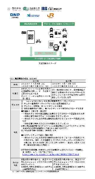 愛知県春日井市 国立大学法人東海国立大学機構名古屋大学 一般財団法人計量計画研究所 大日本印刷株式会社 名古屋鉄道株式会社 東海旅客鉄道株式会社 春日井市MaaS推進検討会が「春日井&周辺地域限定 スマホで参加! おトクに乗りかえプロジェクト」の実証実験を実施します 愛知県春日井市、国立大学法人東海国立大学機構 名古屋大学(以下「名古屋大学」)、一般財団法人計量計画研究所(以下「IBS」)、大日本印刷株式会社(以下「DNP」)、名古屋鉄道株式会社(以下「名鉄」)、東海旅客鉄道株式会社(以下「JR東海」)が参画する春日井市MaaS推進検討会(代表幹事:IBS)では、公共交通の利用促進を目指し、公共交通の利便性向上の検討を進めています。このたび、春日井市内の公共交通をより便利に、おトクに使っていただくための実証実験を実施しますので、お知らせします。 1.実証実験の概要 名鉄が提供するMaaSアプリ「CentX」を活用して「事後決済QR乗車」と「マルチモーダル1利用促進」を行い、一定の条件のもとで対象の交通機関を「乗りかえ」利用する方に対し、おトクな特典をプレゼントします。これにより、公共交通の利用促進を図るとともに、お客さまの利用データをもとにした、快適で便利な公共交通のあり方を検討していきます。詳細は別紙をご参照ください。なお、本実証実験は、国土交通省「日本版MaaS推進・支援事業」の支援を受けて行うものです。 1 「複数の交通手段」を指します。 ※「QRコード」は株式会社デンソーウェーブの登録商標です。 2.実証実験の実施期間・箇所 (1)実施期間 2025年11月から2026年2月にかけ、2期に分けて実施します。 −第1期:2025年11月 4日(火)〜2025年11月30日(日) −第2期:2026年 1月13日(火)〜2026年 2月15日(日) (2)実施箇所 春日井市および周辺地域 (3)対象交通機関 バ ス:かすがいシティバス、北部オンデマンドバス、名鉄バス(春日井市内) 鉄 道:JR中央本線(勝川駅、春日井駅、神領駅、高蔵寺駅) 名鉄小牧線(間内駅、牛山駅、春日井駅、味美駅) 自転車:春日井市レンタサイクル(春日井市役所、JR春日井駅北口自転車等駐車場、JR勝川駅東自転車等駐車場) シェアサイクル:名鉄協商「カリテコバイク」(名古屋市内) その他:名鉄協商カーシェア「カリテコ」(春日井市内) 名鉄協商パーキング(春日井市内の一部)からの乗換 3.本実証実験における各社の役割 ・春日井市 全体調整、交通サービスの提供(かすがいシティバス、北部オンデマンドバス、レンタサイクル事業) ・名古屋大学 学術的支援・指導 ・IBS 計画策定、結果分析、実証実験の運営、予算管理、全体とりまとめ ・DNP 交通結節点におけるデジタルサイネージ等の提供 ・名鉄 MaaSアプリ改修、マルチモーダル利用促進タッチポイント提供、交通サービスの提供(グループ各社含む) ・JR東海 対象駅内へのデジタルサイネージ設置、交通サービスの提供 4.情報の取扱い ・取得したデータは、春日井市MaaS推進検討会が厳正な管理のもと取り扱います。 ・その他、CentX利用規約(https://share.google/5n2bqgc5axjJM1wea)に基づき、適切な取り扱いをします。 5.その他 今後、実施期間や箇所の追加・変更、また上記以外の箇所で同様の調査を行う場合は、春日井市ホームページでお知らせします。 別紙 「実証実験」の詳細 1.実施背景 ・春日井市内では鉄道が4路線整備されており、JR中央本線の各駅を起点とした路線バス網が整備されるとともに、路線バスを補完する役割として市によるコミュニティバス「かすがいシティバス」を運行しています。 ・このように公共交通機関を利用できる環境が整備されている一方で、「春日井市で継続して暮らしたいと思わない」理由の1位に「交通の便が良くない(58.4%)」が挙げられており2、これは鉄道駅沿線以外における路線バスの乗り継ぎの不便さに起因していると考えられます。 ・また、通勤・通学以外の目的におけるマルチモーダルな乗換(例えば鉄道とバスの乗り継ぎ)は市民の移動全体のわずか0.17%という調査結果もあり3、「乗換に感じる抵抗感」をできるだけ軽減する施策が求められています。 ・そこで、春日井市では交通事業者をはじめとした各社と協力し、国土交通省「日本版MaaS推進・支援事業」の支援を受けて「春日井のりかえアップデート・プロジェクト」を立ち上げました。本プロジェクトでは、以下を目指しています。 (1)市民の「乗りかえ」をおトクで快適にすること (2)乗りかえの実態を正確に把握することで、今後公共交通や乗換拠点(交通結節点)をより便利なものに再整備すること 2.実証実験の内容 (1)複数の交通手段(マルチモーダル)の利用促進・参加特典【第1期・第2期】 ・春日井版MaaSウェブサイト「move!かすがい」から、実証実験用の「乗りかえチケット」を取得して実証実験にご参加ください。 ※move!かすがい:https://maas.meitetsu.co.jp/kasugai/ ・「乗りかえチケット」とは、「CentX」内に保存される認証用チケットです。対象の公共交通機関の施設内に設置されたQRコードを読み取り、またはQRコー