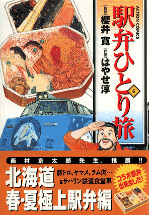 <コミックスのご案内> 『駅弁ひとり旅』第6巻 9月28日発売!! 【監修】櫻井寛 【作画】はやせ淳 <あらすじ> 中原大介は鉄道好きの駅弁好き。そんな大介が結婚10周年に妻・優子からもらったプレゼントは「日本一周鉄道旅行の旅」。 東京駅で寝台特急「富士・はやぶさ」号に飛び乗り、いざ駅弁探索の旅へ! 美味しさいっぱい、旅情たっぷり、絶景オンパレードの『駅弁ひとり旅』、出発進行!! 駅弁にゴクリ! 第6巻に登場する駅弁は12個! 甘辛に煮たホタテがたまらない「最北駅弁帆立」や、加熱式容器でホカホカに温まったラム肉を味わう「ジンギスカン弁当」など、北海道の極上駅弁がぞくぞくと登場します!!! 絶景にうっとり! 神居大橋や、富良野のラベンダー畑、全国の車窓十景に数えられる絶景中の絶景である利尻富士など、北海道の見所がもりだくさん! 北海道からフェリーで行ったサハリン編も見逃せません!! 鉄道の旅なら、全て満載!! 北海道遺産の蒸気機関車、「雨宮21号」に加え、サハリンで観光列車として活躍する「D−51」や、子ども達に大人気の「旭山動物園」号など、たくさんの人気列車と「知って楽しい」鉄道豆知識が満載!! スグに使える! 実践グルメ旅漫画決定版です!! ACTION COMICS 駅弁ひとり旅 6 発 行 日:2008年9月27日 第1刷発行 さくらい かん じゅん 著 者:[監修]櫻井 寛 [作画]はやせ 淳 定 価:630円(税込み) 発 行 者:赤坂了生 発 行 所:株式会社双葉社 図書符号:ISBN978-4-575-83536-6 C9979 ※本編の作品はフィクションです。登場人物・団体等はすべて実在のものとは関係ありません。本書の無断複写・転載・放送・上映等は著作権法での例外を除き、禁じられています。 双葉社ホームページ(双葉社の書籍・コミックが購入できます。)http://www.futabasah.co.jp/ 西村京太郎先生、推薦!! 北海道 春・夏極上駅弁編 豚トロ、ヤマメ、ラム肉…&サハリン鉄道食堂車 コラボ駅弁出来ました! 甘辛鰊とプッチプチの数の子、2つの食感がたまらない『ニシン・カズノコ弁当』。 過熱式容器でホカホカに温まったラム肉を味わう『ジンギスカンホット弁当』。 カニにホタテにイクラにウニ、海の幸てんこもりの『えぞ賞味』。 大人気の「旭山動物園」号や、サハリンで観光列車として活躍する「D−51」も登場する 『駅弁ひとり旅 春・夏極上駅弁編』いざ、出発進行!! 鎌倉の大船軒で、『駅弁ひとり旅』特製駅弁発売中! 詳細は巻末の記事ページにて!! 駅弁ひとり旅<6>目次 第六十一話 遠軽駅◎かにめし 5 第六十二話 旭川駅◎ジンギスカンホット弁当ZooBenグルメbox 25 第六十三話 深川駅◎番屋めし 45 第六十四話 富良野駅◎とんとろ丼 65 第六十五話 名寄駅◎北の味きのこごはん みそ豚丼 85 第六十六話 名寄駅◎ニシン・カズノコ弁当 音威子府駅◎音威子府そば 105 第六十七話 稚内駅◎さいほくかにめし 最北駅弁帆立 127 第六十八話 アインス宗谷船内食◎ランチ弁当 147 第六十九話 サハリン・エクスプレス◎ディナー・セットメニュー 167 第七十話 札幌駅◎やまべ鮭寿し えぞ賞味 187 |