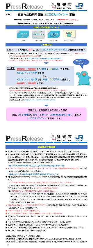 2022年10月18日 京 都 府 舞 鶴 市 西日本旅客鉄道株式会社 舞鶴市鉄道利用促進ICOCAポイント事業の期間延長について 舞鶴市公共交通ネットワーク会議(会長多々見良三舞鶴市長)では、西日本旅客鉄道株式会社と連携し、ICOCAを活用した鉄道利用促進を図ることを目的に、舞鶴市内の東舞鶴駅または西舞鶴駅において、ICOCAを利用して鉄道を乗車または下車された方を対象に、普通運賃の 15%をICOCAポイントで還元する「舞鶴市鉄道利用促進ICOCAポイント事業」を実施しているところですが、更なるICOCA利用促進、秋の観光シーズンにおける鉄道の利用促進を図るため、以下の通り事業期間を延長いたします。 1.延長期間 令和4年(2022年)11月1日(火)〜12月31日(土) ※令和4年(2022年)4月26日(火).10月31日(月)までの実施期間を予定していましたが、引き続き期間を2か月間延長します。 2.実施概要・利用条件 ご利用条件やポイント付与率に変更はありません。<利用条件> ・期間中に、東舞鶴駅もしくは西舞鶴駅からJR線をICOCAで乗車しICOCA利用可能エリア内の各駅で下車、またはICOCA利用可能エリア内の各駅からICOCAで乗車し東舞鶴駅もしくは西舞鶴駅で下車いただくと、JRご利用分(運賃)の15%(1ポイント未満の端数は切り捨て)を後日ICOCAポイントで還元します。 ・ご利用の前日までにICOCAポイントサービスの利用登録(無料)の完了が必要です。 ・詳しい条件や注意事項については、別紙をご覧ください。 ・ICOCAポイントサービスについて詳しくは「JRおでかけネット」https://www.jr-odekake.net/をご欄ください。 3.実施主体 舞鶴市公共交通ネットワーク会議 4.その他 ・期間延長を行ったあとにおいてもICOCAポイントの還元は、予算上限に達した場合終了いたします。 ・新型コロナウイルスの感染状況等により、開催の中止や内容を変更する場合がございます。 ・おでかけの際は、列車内・駅構内においてマスク着用や会話を控えめにしていただくなど、「新しい旅のエチケット」へのご協力をお願いします。 |
