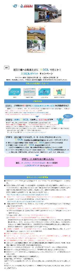 この秋は自転車で近江八幡散策を楽しみませんか! 「駅からはじまるちょこっと自転車たびin近江八幡」について 2022年 9月14日 西 日 本 旅 客 鉄 道株式会社 滋 賀 県 びわこキャンペーン推進協議会 滋賀県近江八幡エリアにて、駅からレンタサイクルに乗って町めぐりを楽しんでいただけるサイクリングのモデルコースを紹介する「駅からはじまるちょこっと自転車たびin近江八幡」についてお知らせいたします。期間中は、ガイドと一緒にサイクリングで巡る特別ツアーやICOCAポイントキャンペーンを開催いたします。この秋は、駅からサイクリングを活用し、開放的な屋外で近郊の自然や今まで知らなかった町の魅力を楽しんでみませんか。 1.ICOCAポイントキャンペーンについて 近江八幡へ自転車たびにICOCAで行こか!ICOCAポイントキャンペーンを開催 期 間:2022年10月1日(土)〜12月25日(日) 内 容:滋賀県や公益社団法人びわこビジターズビューローなどが組織するびわこキャンペーン推進協議会と西日本旅客鉄道株式会社が連携し、滋賀県へのさらなる鉄道利用を促進するため、近江八幡までのアクセスにICOCAご利用のお客様を対象としたICOCAポイントキャンペーンを実施します。 条 件:JR線をICOCAで利用し近江八幡駅で下車、近江八幡エリアの対象スポット(駅リンくん近江八幡駅店、白雲館、ラコリーナ近江八幡のいずれか)でICOCA決済または専用受付端末にタッチ(条件は各スポットで異なります)をされたお客様を対象に、後日JR利用分(行きの片道運賃)の20%のICOCAポイントをプレゼントします。 ※その他、詳しい条件や注意事項については、別紙をご覧ください。 2.モデルコースの作成について 「株式会社あさひ」監修のもと近江八幡エリアの町めぐりに便利なサイクリングコースを作成し、パンフレットにて紹介します。近江八幡駅前で自転車をレンタル、旧城下町エリアの歴史的な町並みや西の湖を通るルート、寄り道スポット等の情報を、コースマップとして掲載しています。初めての方にも安心してご参加いただけるよう、コース上の注意点や目印についても、分かりやすくご紹介いたしました。また、スマートフォンでも見ることができるGPS付きのWEBマップを公開します。 3.現地での特別企画及び割引特典について (1)特別企画 @観光ガイドとめぐる近江商人町並み散策 期 間:2022年10月1日〜12月24日までの毎週土曜日 時 間:10:30〜12:00 料 金:無料 予 約:5日前までにお電話(0748-32-7003)か メール(omi8@sweet.ocn.ne.jp)にて予約 内 容:白雲館に自転車を置いて町歩き。 ガイドが各名所にまつわる歴史や裏話を解説。 コース:白雲館(集合)→ヴォーリズ像→新町通り→八幡掘→日牟禮八幡宮(解散) AJR×サイクルベースあさひ「ガイドさんと巡る近江八幡満喫サイクリングツアー」 日 程:10月15日(土)、11月3日(祝)、11月19日(土)、11月20日(日) 時 間:10:00〜17:00 料 金:10,000円(ガイド料、レンタサイクル費用、保険料) 定 員:各回10名 ※事前に「ちりりん」サイトにて要予約 内 容:「株式会社あさひ」が主催するサイクリングツアーを開催いたします。 近江八幡駅をスタートし、近江商人とヴォーリズの足跡をたどりながら歴史ある水郷の里をめぐる自転車ならではのルート設定で水路沿いをサイクリング。琵琶湖湖畔のサイクリングルートも取り入れてビワイチの雰囲気も感じていただけるツアーです。 【予約サイト】https://chiririn.jp/portal/event/2022/09/101511311191120.html (2)割引特典 パンフレットに水郷巡りの200円引きクーポンを掲載します。 4.宣伝物ビジュアル *伊藤注:添付画像をご覧下さい。 5.新型コロナウイルス感染症拡大防止について 感染拡大の状況によっては企画が急きょ中止や変更となる場合がございますので、事前にHP等でご確認ください。 |