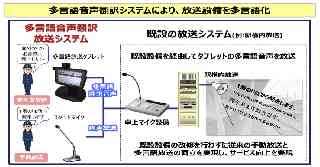 パナソニックシステムソリューションズジャパン株式会社 西日本旅客鉄道株式会社 〜訪日外国人のお客様へのご案内を充実させます〜 「メガホンヤク(R)」のソフトウェアを応用した 「多言語音声翻訳放送システム」の導入駅を拡大します! JR西日本では、訪日外国人のお客様の受入態勢の充実を図るため、外国人案内スタッフの配置、通訳サービスや多言語車内放送サービスの導入などを進めているところです。 昨年、近畿エリア内の訪日外国人のお客様のご利用が多い5駅に、パナソニック製のメガホン型多言語音声翻訳サービス「メガホンヤク(R)※」のソフトウェアをTOUGHPAD(タブレット端末)に搭載し、駅構内の放送設備に接続した「多言語音声翻訳放送システム」を導入いたしました。このシステムにより、駅のコンコースやホームに、予め登録した英語・中国語・韓国語のご案内を放送することが可能になります。この度、導入駅を拡大することといたしましたので、対象駅及び使用開始時期をお知らせいたします。 このシステムを活用して、JR西日本の駅をご利用になる訪日外国人のお客様へのご案内をさらに充実させてまいります。 ■今回対象駅(19駅): 金沢、富山、新神戸、岡山、福山、小倉、博多、新大阪、大阪、三ノ宮、大阪城公園、森ノ宮、JR難波、新今宮、稲荷、嵯峨嵐山、二条、梅小路京都西、山科 (参考)昨年導入駅:京都、西九条、ユニバーサルシティ、天王寺、姫路 計24駅 ■使用開始日(予定):2019年3月25日以降準備出来次第 ※メガホンヤク及び、TOUGHPADは、パナソニック株式会社の登録商標です。 |