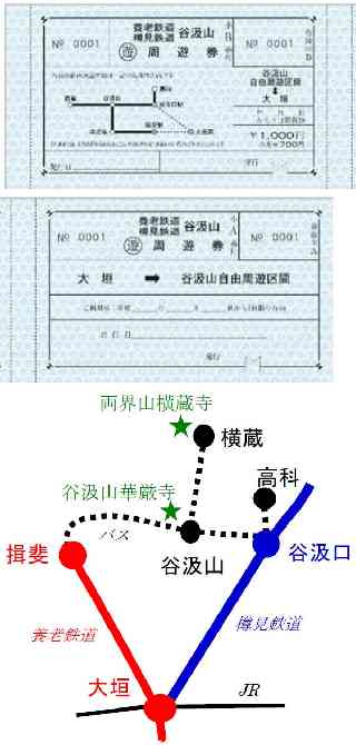 ・大垣駅から谷汲山バス停まで、養老鉄道揖斐駅経由または樽見鉄道谷汲口駅経由経由いずれでも往復可能(鉄道線内は途中下車可)