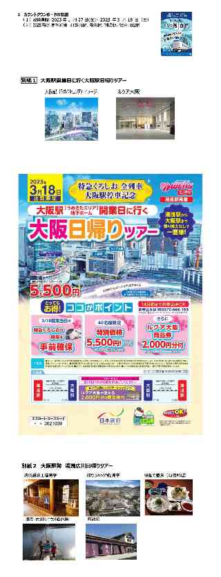 西日本旅客鉄道株式会社 和 歌 山 支 社 株式会社日 本 旅 行 特急くろしお全列車大阪駅停車記念 カウントダウンボードの設置及び記念ツアーの実施について 2023年3月18日のダイヤ改正から、特急「くろしお」が大阪駅に停車できるようになり、関西鉄道ネットワークの中心である大阪駅と和歌山県内特急「くろしお」停車駅のダイレクトアクセスが可能となります。つきましては、皆さまに大阪駅(うめきたエリア)開業を知っていただき、ご一緒に盛り上げていただきたいとの思いから、開業50日前となる 1月27日から、きのくに線内の一部の駅に「カウントダウンボード」を設置しております。あわせて、ダイヤ改正当日限定で湯浅駅発着の記念ツアーをご用意いたしましたので、ぜひこの機会に、さらに便利になった大阪駅と特急「くろしお」をご利用ください。 1 カウントダウンボードの設置 (1)設置期間 2023年1月27日(金)〜2023年3月18日(土) (2)設置場所 きのくに線 和歌山駅、湯浅駅、御坊駅、紀伊田辺駅 2 特別な旅行プラン「特急くろしお全列車大阪駅停車記念ツアー」の発売 (日本旅行主催) ダイヤ改正当日、湯浅広川えきからワクワク検討委員会と連携して、さらに便利になった大阪駅と特急「くろしお」をご利用いただける2つの記念ツアーを実施します。 (1)ツアー名:大阪駅開業日に行く大阪駅日帰りツアー ・出 発 日:2023年3月18日(土曜日) ・募集人員:40名 ・旅行代金:おとな1名様:5,500円 こども(小学生)1名様:2,700円 ・ツアーのポイント:湯浅駅から大阪駅間往復特急利用 ルクア大阪商品券2,000円付き ※詳細は別紙1をご確認ください。 (2)ツアー名:大阪駅発 湯浅広川日帰りツアー ・出 発 日:2023年3月18日(土曜日) ・募集人員:40名 ・旅行代金:おとな1名様:5,500円 こども(小学生)1名様:2,700円 ・ツアーのポイント:添乗員同行プラン、大阪駅から湯浅駅間往復特急利用 醤油作り体験、ランチ、稲むらの火の館、シロウオ漁体験、記念品プレゼント ※詳細は別紙2をご確認ください。 3 その他 ダイヤ改正当日(3/18)は、特急くろしおの全列車が大阪駅に停車することを記念し、湯浅駅において記念式典を開催します。詳細については、後日あらためてご案内いたします。 [主な内容]主催者挨拶、来賓祝辞、特急くろしお(記念ツアー)のお見送りイベント等 別紙1 大阪駅開業日に行く大阪駅日帰りツアー 湯浅駅から特急「くろしお」に乗ってさらに便利になった大阪駅へ遊びに行こう! 新しく開業した大阪駅(うめきたエリア)で下車した後は、大阪駅直結の駅型商業施設「ルクア大阪」でランチ、またはショッピング♪参加者全員(おとな・こども)にルクア商品券2,000円の特典付き!家族みんなで楽しめます。 出 発 日:2023年3月18日(土曜日) 旅行代金:おとな1名様:5,500円、こども(小学生)2,700円 ※小学生未満の設定はございません。同伴される場合のくろしおのお席は同伴者と同一となります。お席が必要な場合は「こども」でお申込みください。 発 売 日:2023年2月3日(金曜日)15:00〜 専用パンフレットに記載のお電話にて予約受付 お申込み電話番号:0570-666-155(14日前まで受け付け) パンフレットは準備出来しだい、湯浅町の美味いもん蔵、観光交流センター、広川町の道あかり、ふれあい館、滝原温泉ほたるの湯等で配布します。 行 程:行き 湯浅駅(10:16発/くろしお14号)⇒大阪駅(11:46着) 帰り 大阪駅(17:18発/くろしお21号)⇒湯浅駅(18:56着) ツアーポイント:湯浅駅から大阪駅間往復特急利用、ルクア大阪商品券2,000円付き。大阪駅到着後はフリータイムです。ルクア大阪にてランチやショッピングなど思い思いのお時間をお過ごしください。 そ の 他:添乗員は同行いたしません。詳しくは添付のパンフレットをご覧ください。 別紙2 大阪駅発湯浅広川日帰りツアー 大阪駅(うめきたエリア)開業で便利になった特急「くろしお」に乗ってエモい町「湯浅町・広川町」にお出かけしませんか?湯浅町と広川町は、隣接する町でありながら、異なったストーリーで日本遺産認定を受けており、歴史ロマンあふれる街並みや名物「シロウオ」料理など魅力たっぷり。湯浅町・広川町を貸切バスでラクラク観光♪お気軽に日帰りで楽しんでいただけます。 出 発 日:2023年3月18日(土曜日) 旅行代金:おとな1名様:5,500円、こども(小学生)2,700円 ※小学生未満の設定はございません。同伴される場合のお席等は同伴者と同一となります。くろしおやバスのお席、お食事が必要な場合は「こども」でお申込みください。 発 売 日:2023年2月3日(金曜日)15:00〜(14日前まで受け付け) 専用Webページで予約受付 (https://www.nta.co.jp/akafu/west/danrin/yuasa/) 行 程:行き 大阪駅(9:04発/くろしお3号)⇒湯浅駅(10:37着) 帰り 湯浅駅(17:16発/くろしお28号)⇒大阪駅(18:46着) ◎湯浅駅到着後は貸切バスにて「湯浅町」「広川町」を散策します。 湯浅醤油工場見学とMY醤油づくり体験⇒日本料理「横楠」で海鮮料理の昼食(シロウオ踊り食い体験あり)⇒稲むらの火の館見学⇒湯浅・広川シロウオ漁体験⇒伝建地区散策 ツアー