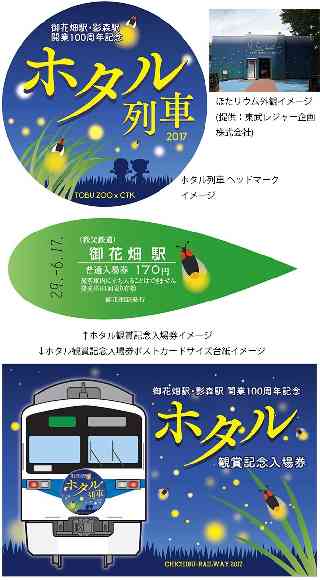 秩父鉄道株式会社 東武レジャー企画株式会社 初夏のホタル観察&観賞を楽しもう 秩父鉄道×東武動物公園「ホタル列車」や記念入場券発売 〜御花畑駅・影森駅開業100周年記念〜 秩父鉄道株式会社(本社:埼玉県熊谷市、代表取締役社長:大谷 隆男)と東武動物公園(運営:東武レジャー企画株式会社、本社:埼玉県南埼玉郡宮代町、取締役社長:日置 岳人)では、6月24日(土)に専用車内でホタルを間近で観察できる「ホタル列車」を運行します。車内では東武動物公園の「ほたリウム」で飼育している「ヘイケボタル」を観察しながら、同園の飼育係からの説明を聞くことができるほか、御花畑駅下車後に秩父市内ホタル観賞スポットへご案内します。また、「ホタル列車」運行を記念した特別仕様の入場券も発売します。詳細は下記のとおりです。 ■1.秩父鉄道×東武動物公園「ホタル列車」 〜御花畑駅・影森駅開業100周年記念〜 (1) 運行日 2017年6月24日(土) (2) イベント開催区間 秩父鉄道 急行秩父路9号(くだり熊谷駅―御花畑駅間)・専用車両1両 <おもな停車駅時刻> 熊谷駅発(18:30)→寄居駅発(18:50)→長瀞駅発(19:06)→御花畑駅着(19:23) (3) 参加費 無料 ※ご乗車には普通乗車券のほか急行券(大人200円小児100円)が別途必要です。 (4) イベント内容 ・専用車内でホタル観察 ※明るい場所での昆虫観察です。 ・東武動物公園飼育係による説明 ・ご乗車の方に特別乗車記念証をプレゼント ・御花畑駅下車後、希望者を秩父市内ホタル観賞スポットへご案内(徒歩) (秩父市上町・御花畑駅下車徒歩約20分) ※観賞スポットに行かれる方は懐中電灯をご持参のうえ、歩きやすい服装でご参加ください。 ※観賞後は自由解散です。 ※雨天の場合、ホタル観賞はできません。 ・特別ヘッドマーク掲出(6月17日(土)〜7月17日(月・祝)・6000系車両1編成) ■2.「ホタル観賞記念入場券〜御花畑駅・影森駅開業100周年記念〜」の発売について 「ホタル列車」運行を記念した特別仕様の入場券を発売します。 (1) 発売期間:2017年6月17日(土)〜7月17日(月・祝) (2) 発売箇所:秩父鉄道熊谷駅、秩父駅、御花畑駅、 通販サイト「ちちてつe-shop」 (3) 発売価格:170円 (4) 券の仕様:・葉っぱ型カラー硬券入場券 ・ポストカードサイズ台紙付 ■3.御花畑駅・影森駅開業100周年について 秩父鉄道御花畑駅および影森駅は、第一次世界大戦後のセメント需要の増加に対応するために1917(大正6)年9月27年に開業し、2017年で開業100周年を迎えます。 御花畑駅の駅舎は、創業当初の様子を今もなお色濃く残しており、2004(平成16)年2月17日に秩父市登録有形文化財に登録されました。「芝桜の丘に一番近い駅」としてお客様をお迎えするために、平成21年4月1日に副駅名(愛称)として「芝桜駅」が設定されました。駅名看板などが芝桜のイメージに統一されています。 影森駅は、貨物駅として開業し、1918(大正7)年3月15日に一般旅客営業を開始しました。 ■秩父地域の主なホタル観賞スポット 6月中旬〜7月上旬 ※天候等により異なります 豊かな自然が残る秩父地域ではホタル観賞が楽しめます。 ○秩父市上町 交通:秩父鉄道御花畑駅下車徒歩約20分 ○秩父ミューズパーク 交通:秩父鉄道秩父駅下車タクシー利用 ○花ハス園・水芭蕉園 交通:秩父鉄道武州日野駅下車徒歩約10分 ■東武動物公園「ほたリウム」概要 展示時間:11時00分〜16時00分(時間変更あり) 場所 :東武動物公園内 所要時間:約15分 料金 :400円(税込) 定員 :18名(入替制) 施設内容:「ほたリウム」は通年でホタルが鑑賞できる劇場型の施設です。ヘイケボタルが約1万匹生息しており、ホタルが産卵する陸地と幼虫が生息する水場が再現された大型水槽(2m×2m×3m)で常時50匹から100匹のホタルを展示しています。暗闇で約7分間、目を慣らしていただき、その後ホタルの光をゆっくり見ることができます。 |