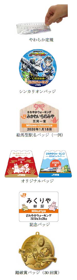 2019年12月18日 東海旅客鉄道株式会社 「さわやかウォーキング」(1月〜3月)の開催について 「さわやかウォーキング」は、当社沿線の駅から気軽にご参加いただけるウォーキングイベントです。今冬は、ファミリーチャレンジコースなどご家族でさわやかウォーキングをより楽しんでいただける企画を新たにご用意し、新規の18コースを含めた計58コースを、地元の皆様のご協力をいただいて開催します。皆様の奮ってのご参加をお待ちしております。 1.開催日:2020年1月5日(日)〜3月29日(日)の土休日 2.おすすめの企画 (1) ファミリー向け企画 @ファミリーチャレンジコース ご家族で各コースの歴史や文化を学びながらウォーキングをお楽しみいただけるコースです。各対象コースのコースマップに記載のクイズに答えると、小学生以下の方先着1,200名様に「やわらか定規」をプレゼント。 A10回Kids賞の新設 2020年1月より、さわやかウォーキング10回参加賞品として、(R)新幹線変形ロボシンカリオンのキャラクターがデザインされた「シンカリオンバッジ」1,000個を限定でプレゼント。(※先着順。無くなり次第終了) (2) 各エリアのおすすめコース @新春キャンペーンコース(名古屋地区) 豊川稲荷(豊川市)や愛宕山龍泉寺(松阪市)など、新年ならではの初詣におすすめのコースです。当キャンペーンコースにて、「絵馬型駅名バッジ」をプレゼント。(※先着順。各コースで先着個数が異なります) A富士山ビューコース(静岡地区) ウォーキング中に富士山の山頂まではっきりとご覧いただける季節となりました。静岡地区を3つに分けた各エリアから、1コースずつ参加された方に先着で「オリジナルバッジ」をプレゼント。 (※全2種類各1,000個。どちらかを進呈) B御厨駅開業記念コース(静岡地区) 来年3月に開業する東海道本線・御厨駅スタートのウォーキングを初開催します。コース開催前には記念セレモニーを実施するほか、コースに参加された方に駅名入りの「記念バッジ」をプレゼント。(※先着3,000名様) (3) 踏破賞の参加賞品について 2020年1月から1年間の参加賞品10回賞・20回賞・30回賞の「踏破賞オリジナルバッジ」は、ストラップを付けてメダル風にも使用できます。 (※先着順、数量限定) <開催のご案内等> ※「さわやかウォーキング」の開催時間やコースの詳細は、JR東海の主な駅にある専用パンフレットやさわやかウォーキングのホームページ( https://walking.jr-central.co.jp/ )で、ご案内しています。 ※各コースの開催可否は、当日朝6時以降にJR東海テレフォンセンターでご案内します。 (JR東海テレフォンセンター:050-3772-3910サービス番号96:00〜24:00年中無休) ※写真・イラストはすべてイメージです。 |