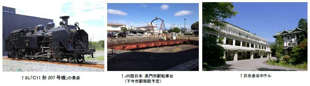 キャプション: SL「C11 形207 号機」の勇姿、JR西日本 長門市駅転車台 (下今市駅移設予定)、日光金谷ホテル