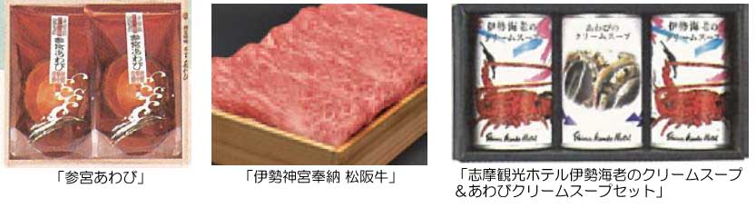キャプション: プレゼント賞品 「参宮あわび」50名様 「伊勢神宮奉納 松阪牛」50名様 「志摩観光ホテル伊勢海老のクリームスープ&あわびクリームスープセット]70名様