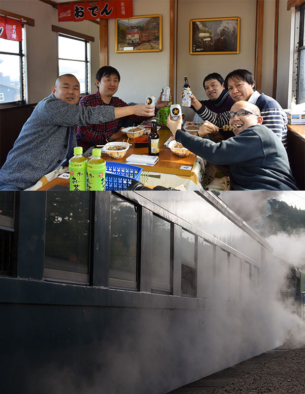 キャプション: おでん列車車内(上)と暖かい蒸気暖房(下)