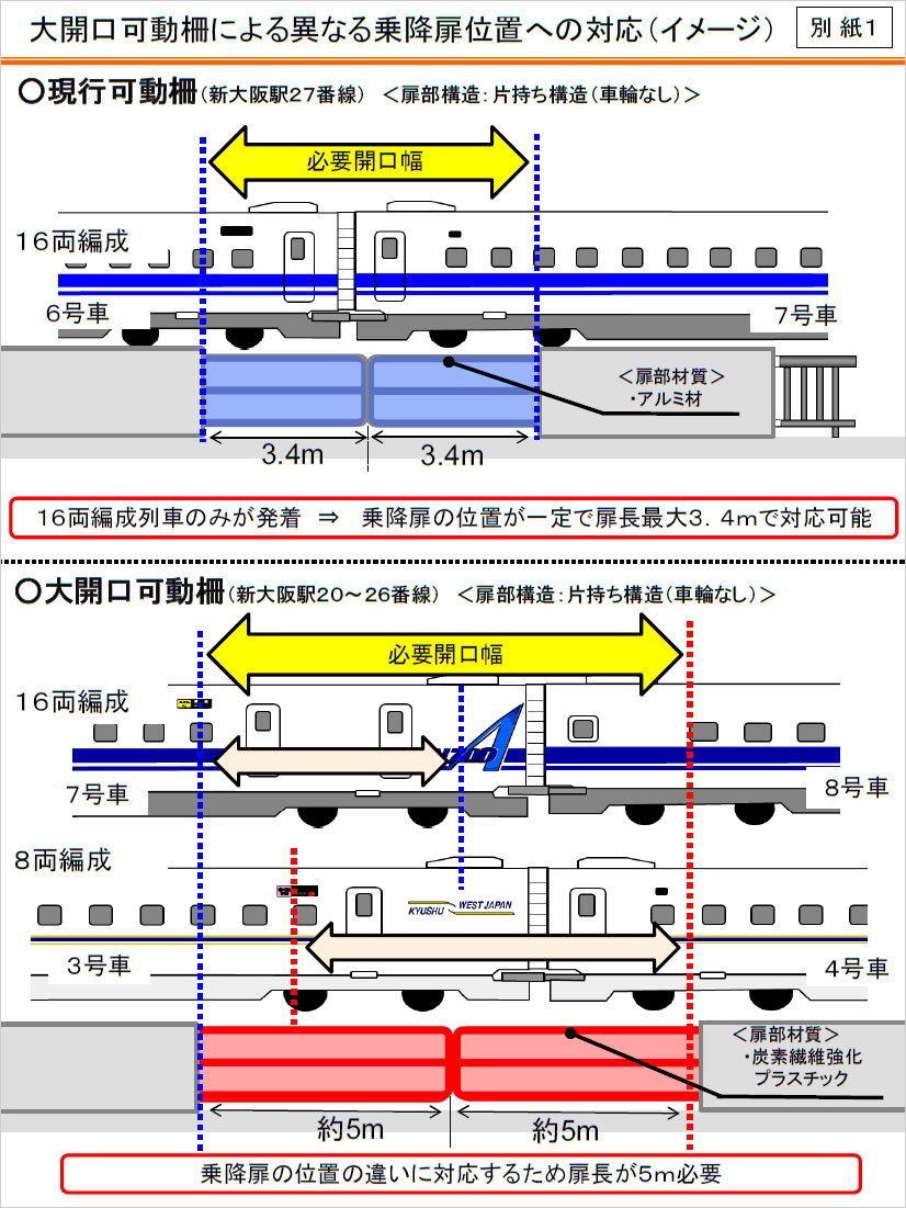 キャプション: 別紙1 大開口可動柵による異なる乗降扉位置への対応(イメージ)